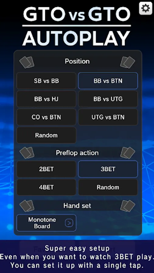 You can watch not only randomly, but you can also specify the board texture, such as "monotone board," or the hand, such as "AK is dealt.