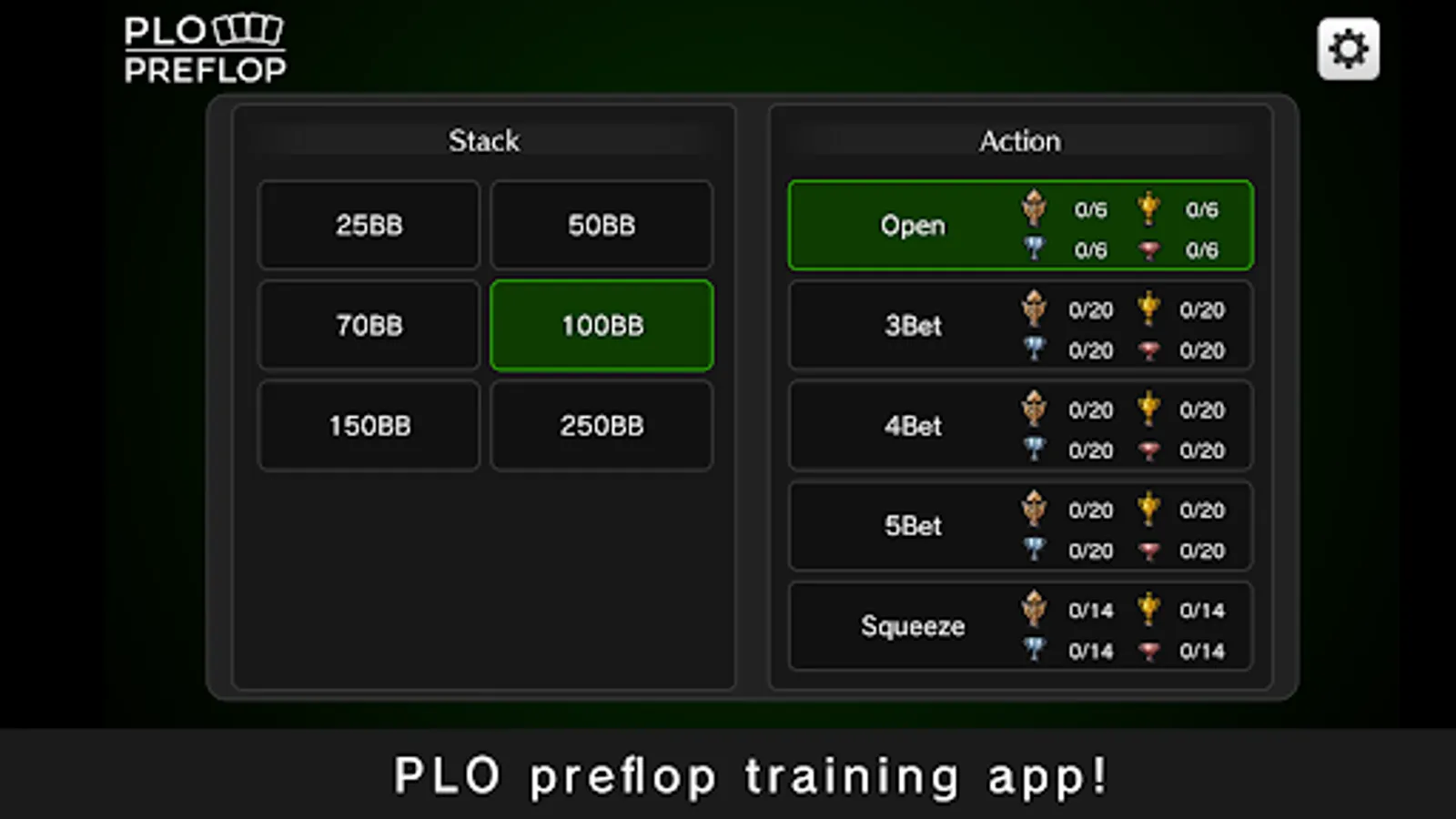 You can practice "Open", "3BET", "4BET", "5BET", and "Squeeze" preflop.