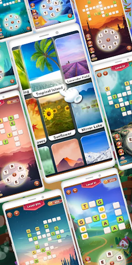 Enjoy modern word puzzles with word searching, anagrams, and crosswords! Immerse yourself into the beautiful scenery backgrounds to relax and ease your mind.