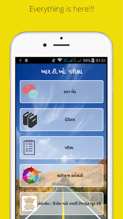 - Exam : Exactly same as RTO test, random questions and road signs related questions will be asked in this exam.Time limit for each question will be 30 seconds(Exam Mode)