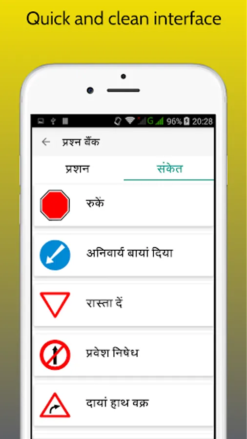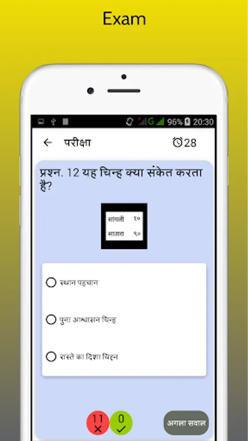 - Exam : Exactly same as RTO test, random questions and road signs related questions will be asked in this exam.Time limit for each question will be 30 seconds(Exam Mode)