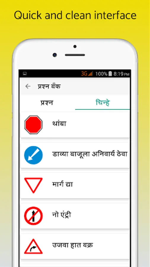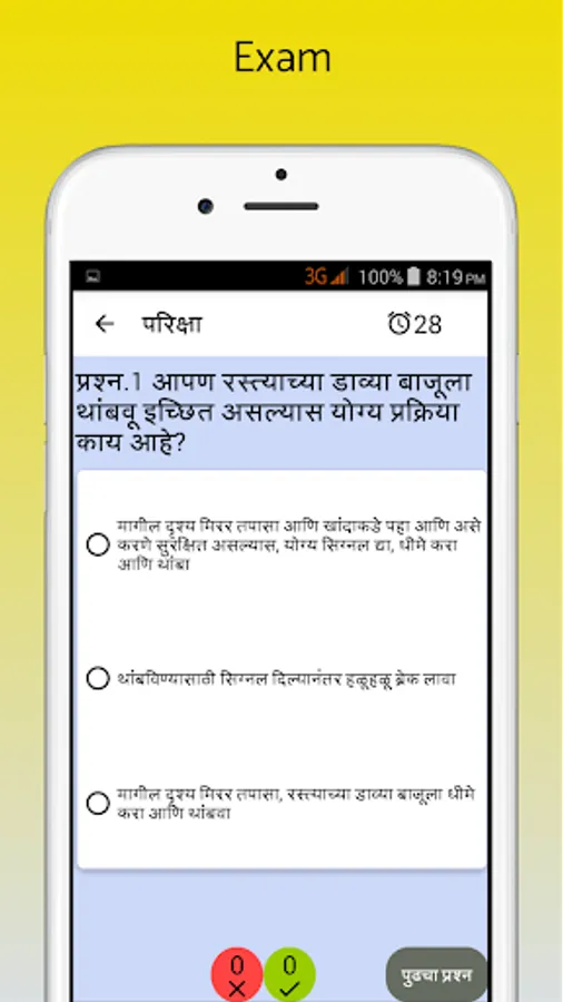 - Exam : Exactly same as RTO test, random questions and road signs related questions will be asked in this exam.Time limit for each question will be 30 seconds(Exam Mode)