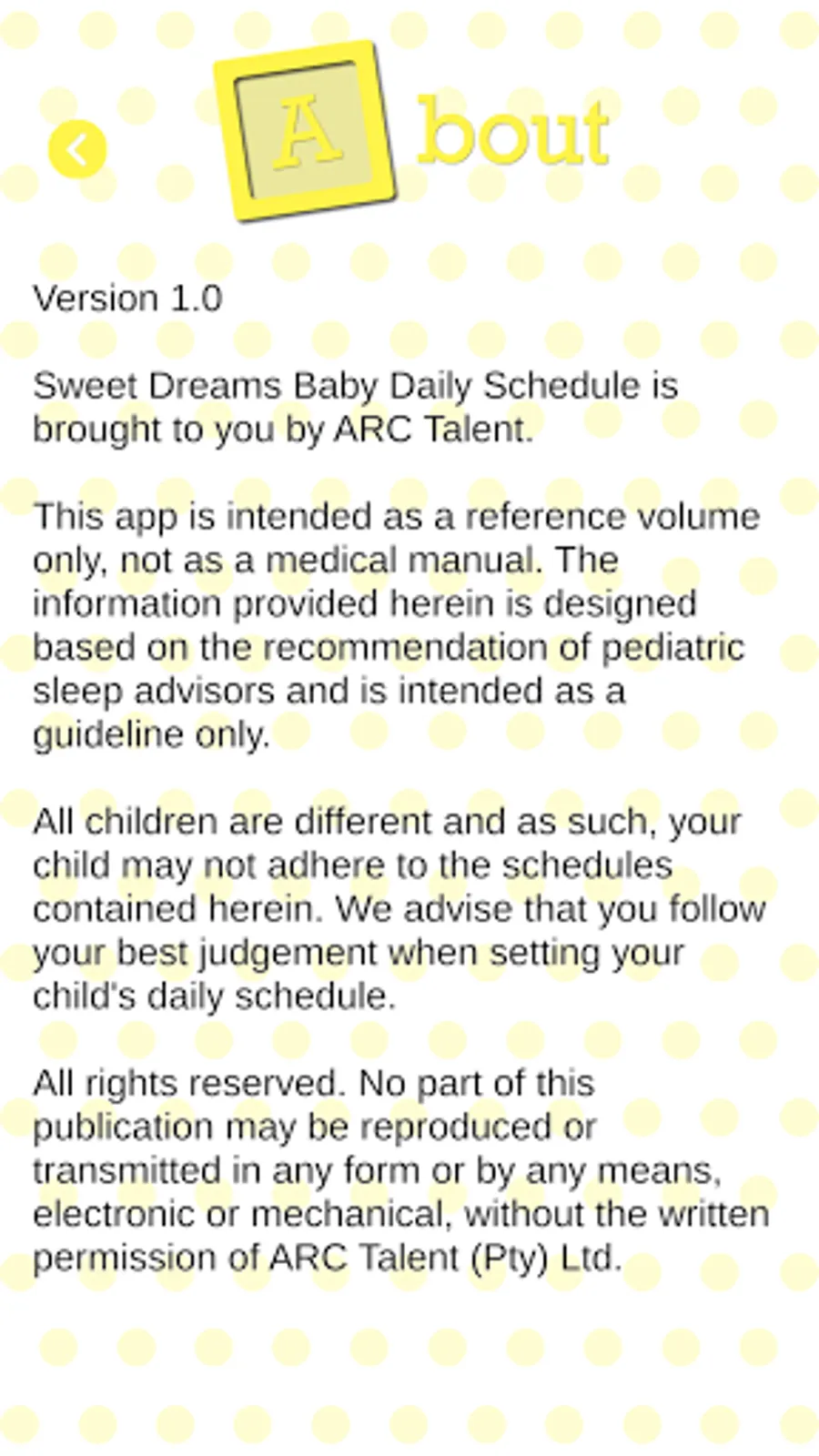 This app is intended as a reference volume only, not as a medical manual. The information provided herein is designed based on the recommendation of pediatric sleep advisors and is intended as a guideline only.