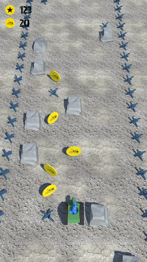 Simple arcade game with a military theme. How long can you go with the tank without hitting a tank trap or driving into an explosion?