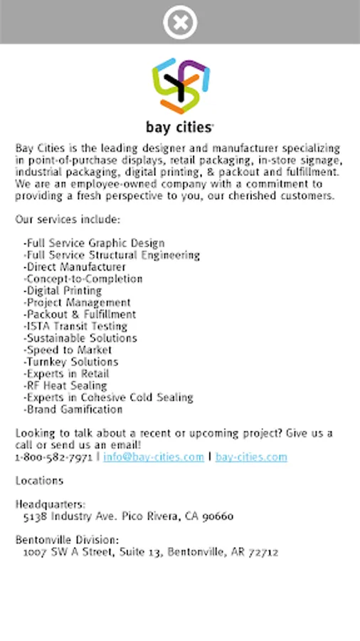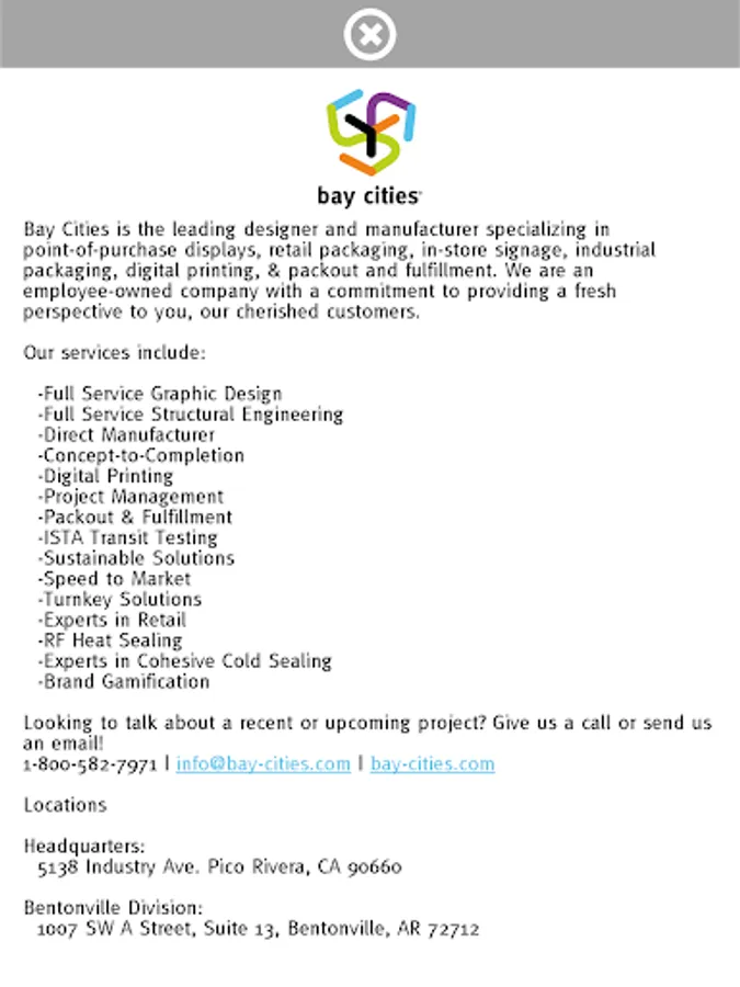 Greetings! And welcome to the Bay Cities app where you can learn everything you need to know about retail packaging and displays. Already a customer? Perfect – you can easily contact us to chat about your recent projects and learn what else we can do for you.