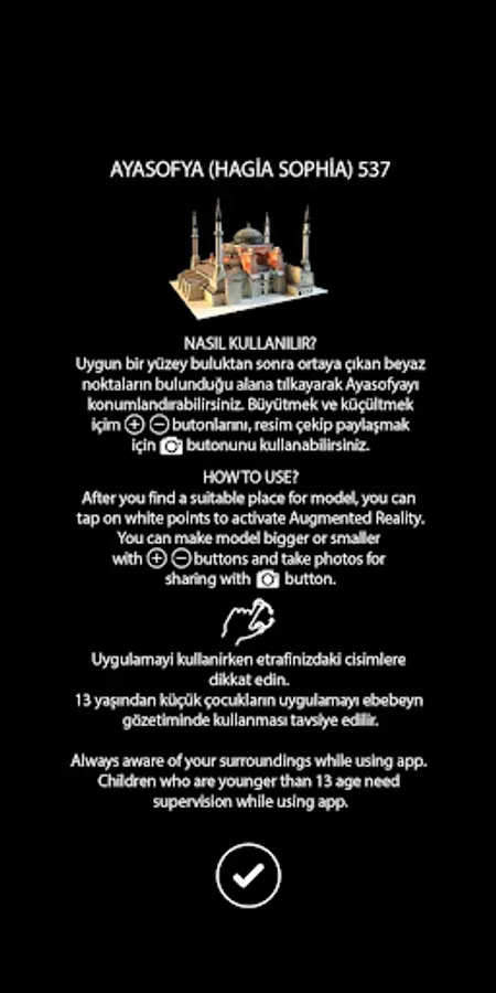 We bring Hagia Sophia, one of the living legends of the world, to your environment with Augmented Reality. You can define the model of Hagia Sophia in the area you want and you can examine this unique work in 3D and even take a picture as if you were next to it.