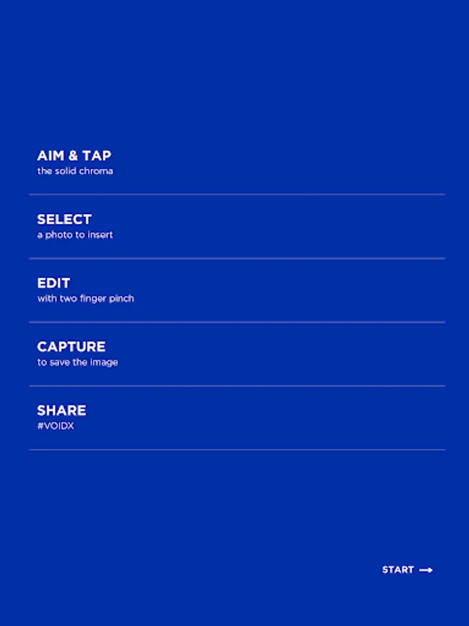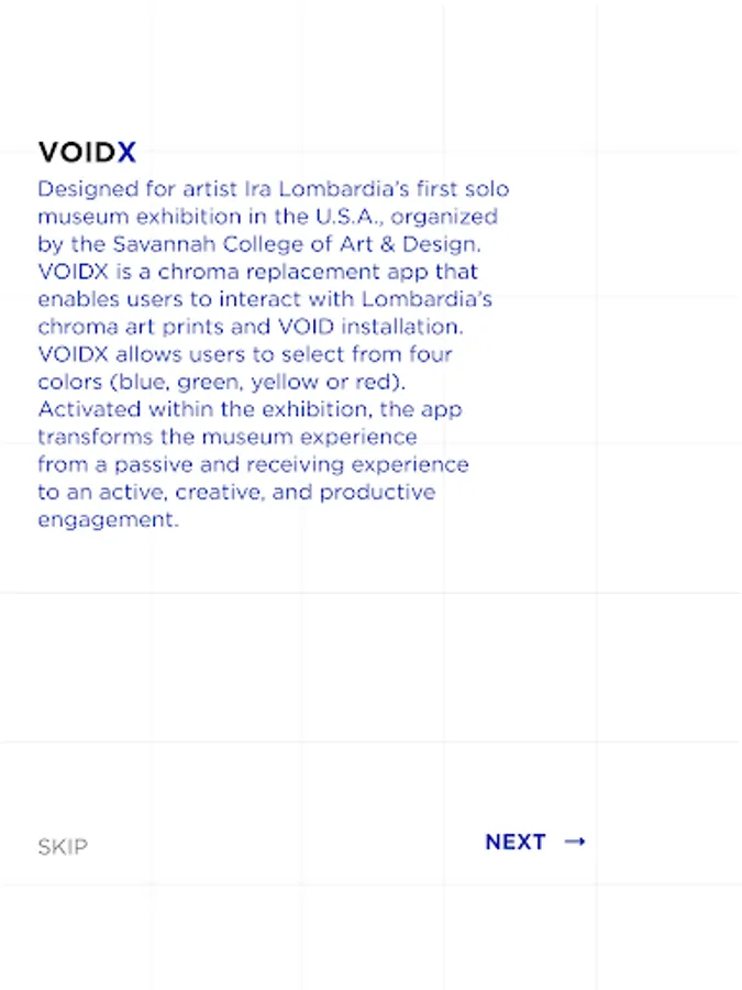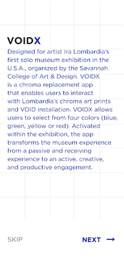 VOIDX - designed for artist Ira Lombardia’s first solo museum exhibition in the U.S.A., organized by the Savannah College of Art & Design. VOIDX is a chroma replacement app that enables users to interact with Lombardia’s chroma art prints and VOID installation. VOIDX allows users to select from four colors (blue, green, yellow or red). Activated within the exhibition, the app transforms the museum experience from a passive and receiving experience to an active, creative, and productive engagement.
