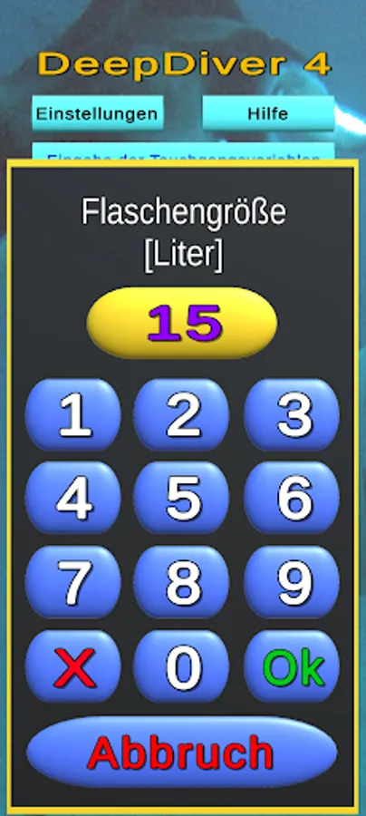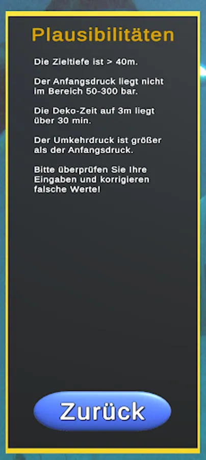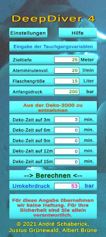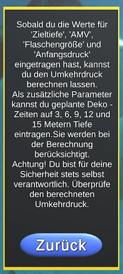 This app is able to calculate the reverse pressure after entering some necessary parameters. This is a safety precaution when diving and determines the pressure at which you start diving, so that in the event of a complete failure of the air supply to a buddy, both of them can safely reach the surface, breathing from a bottle.