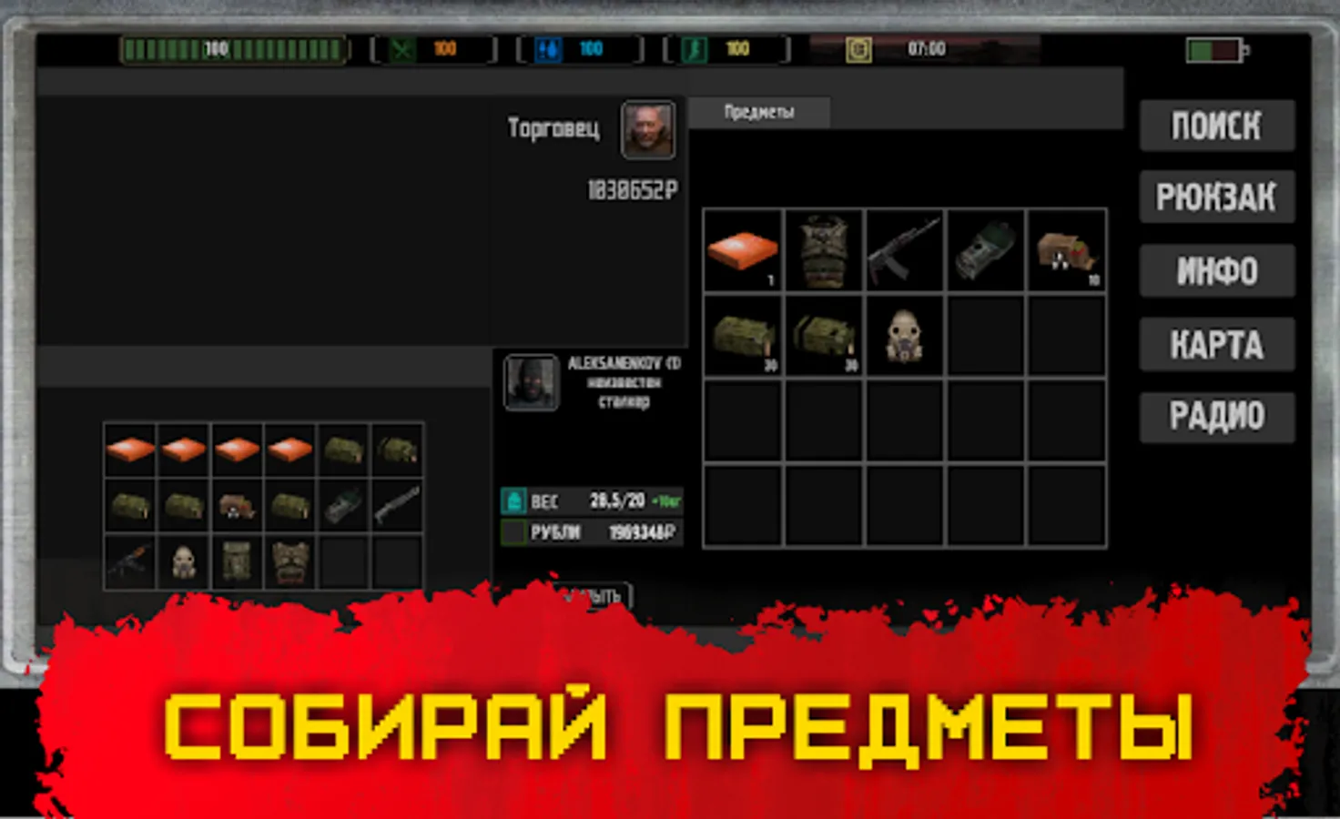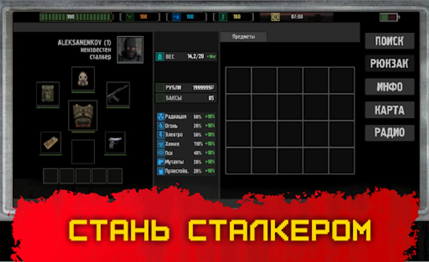 Play without internet! Complete quests, craft items and weapons. The real hunger games are waiting for you! Monsters, zombies, thirst, countless diseases and injuries, bloodthirsty enemies - all this has to be overcome in order to save your life in a survival game. Feel like a real stalker and experience hardcore by surviving in "Like life" mode.