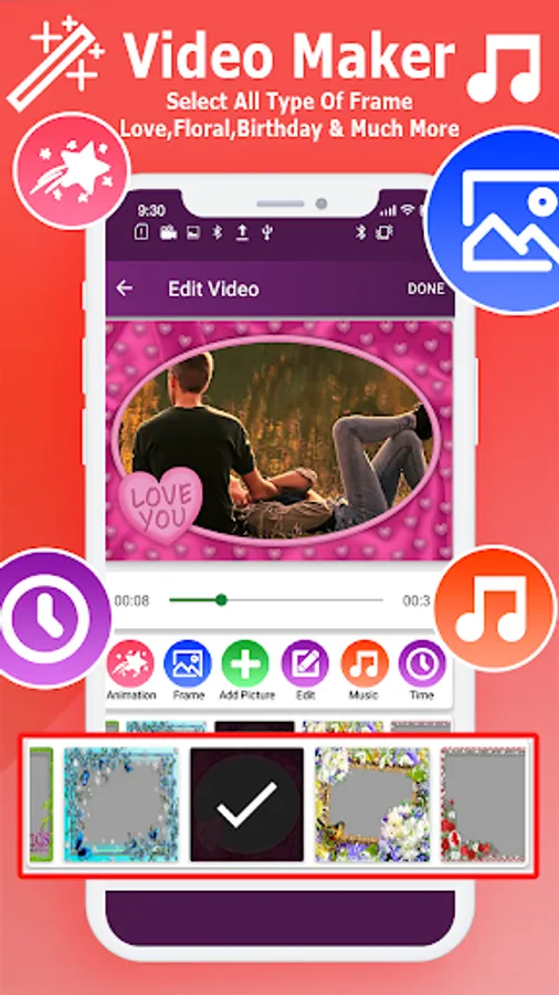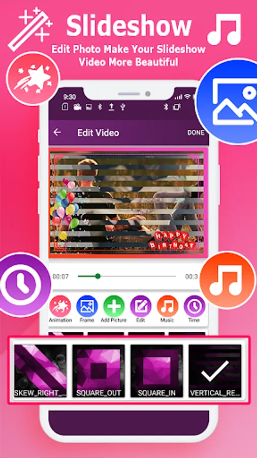 In the Edit Video screen you will see many different options such as Animation, Frame Selection, Add Pictures, Edit Photos, Music Selection, Time Duration.