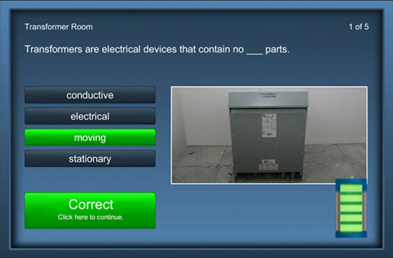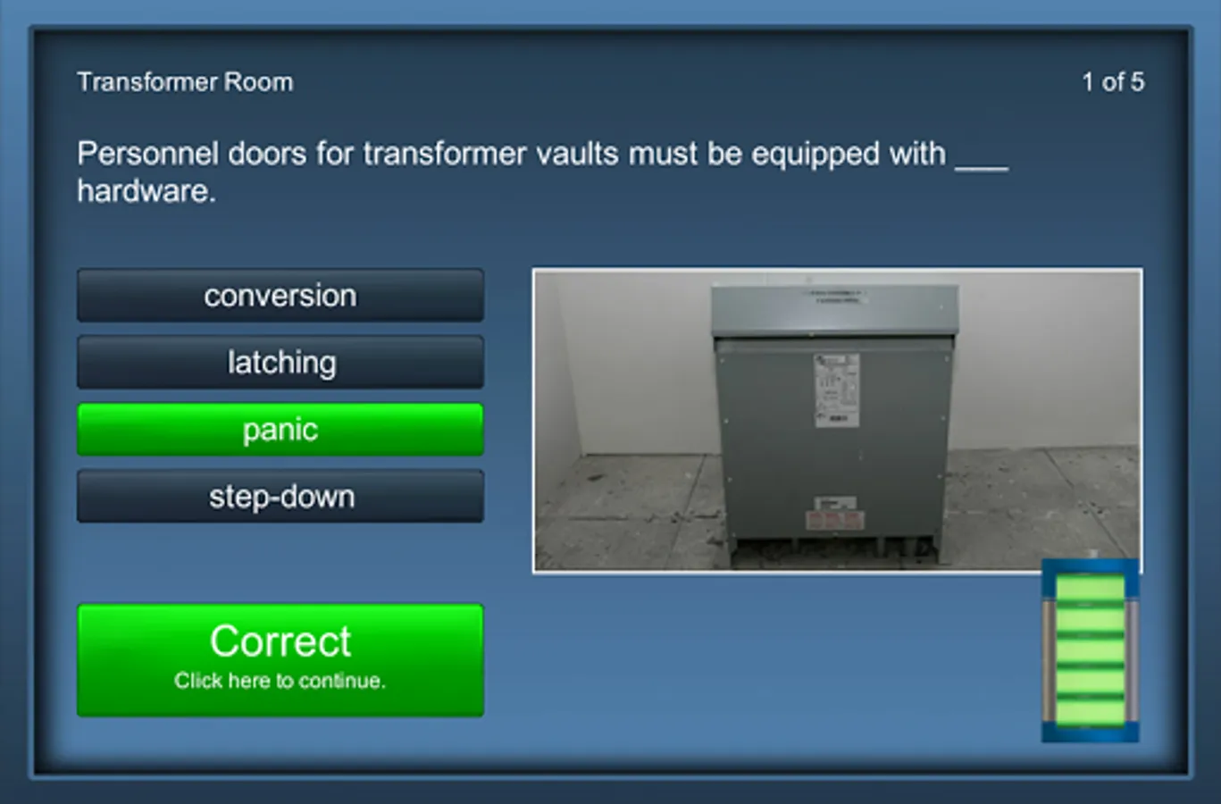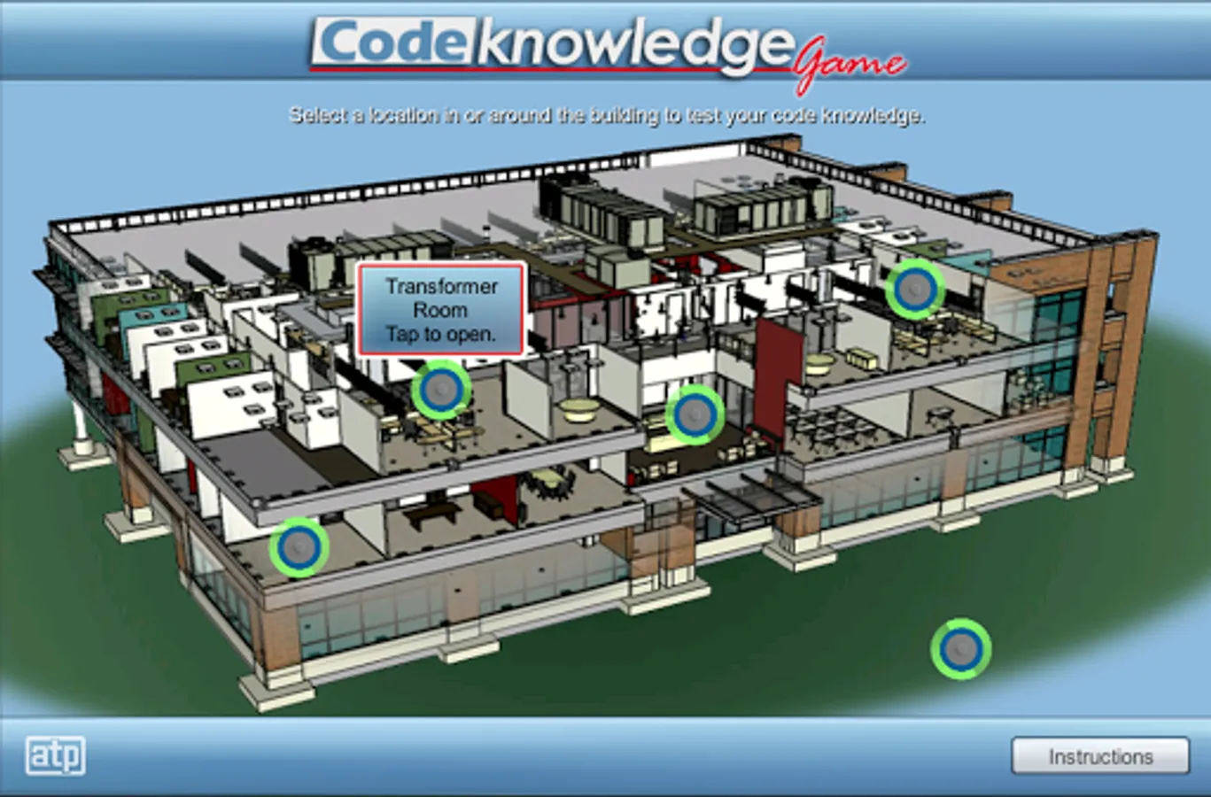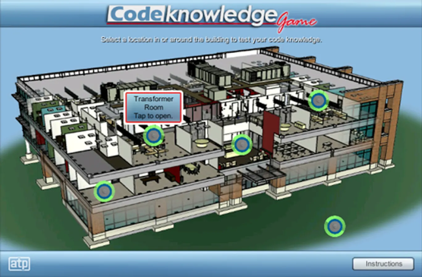 Scenarios are presented within a typical commercial building. Each scenario displays five questions related to a location in the building. Answering all questions in one location allows the player to move on to another location. The game is completed by visiting all locations and answering all questions in each location.
