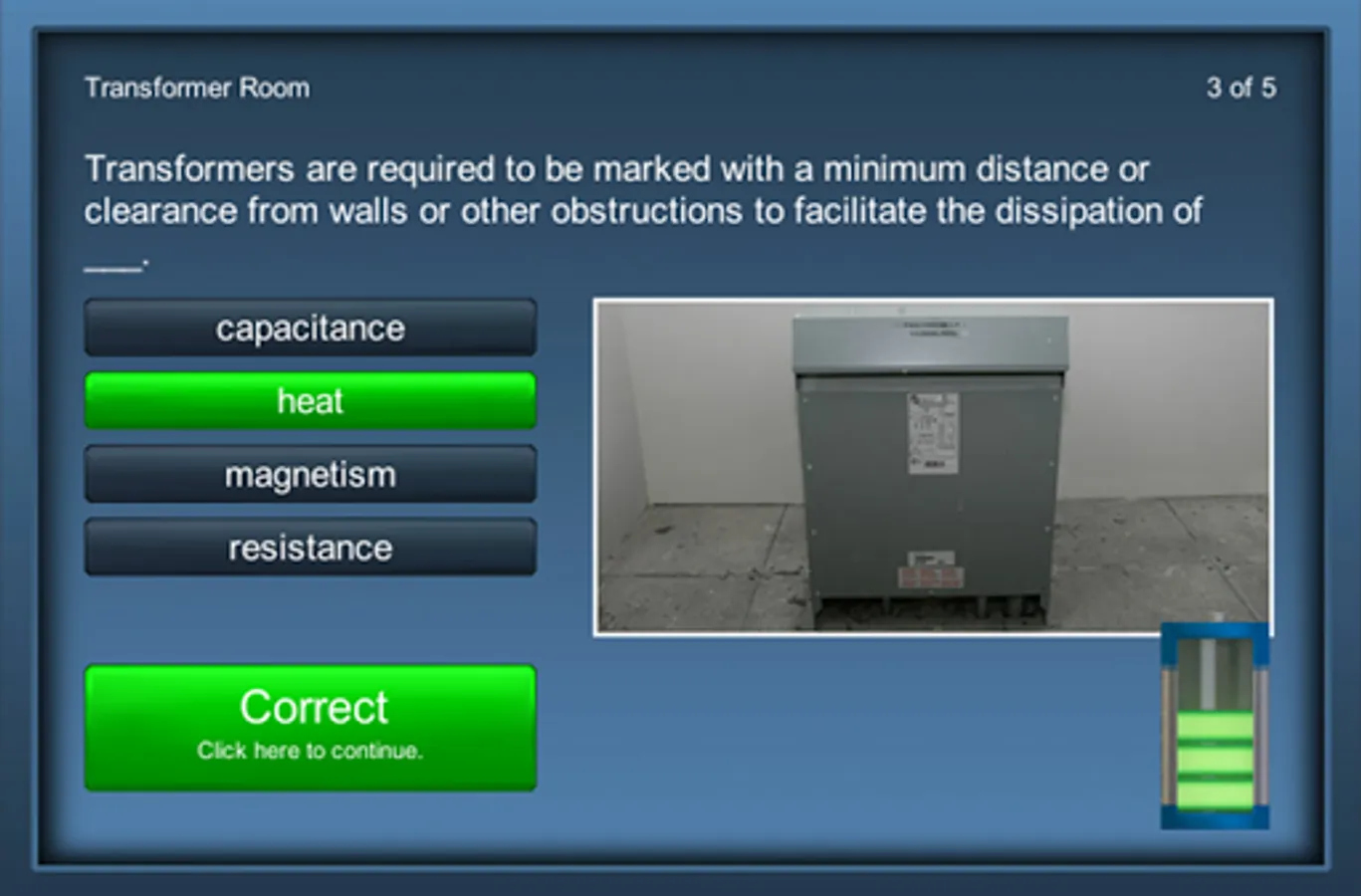 The player begins the game by selecting a location of the building to visit. Five questions based on that location are displayed in sequence along with a fully charged battery. A question answered correctly advances the player to the next question. A question answered incorrectly decreases the charge level of the battery. If the battery in any location becomes depleted entirely, the player is sent to the emergency room to answer a random healthcare facilities question for a chance to recharge the battery and stay in the game. If the question is answered correctly, the battery will be recharged, and the player can continue the game. If the question is answered incorrectly, it’s game over!