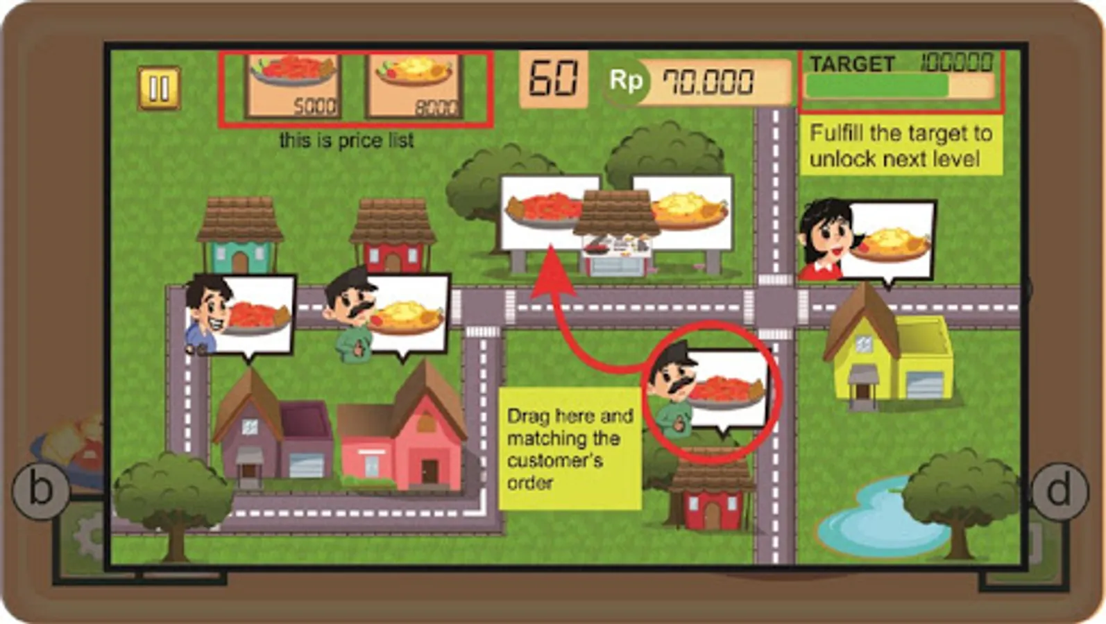 This game is a culinary game, players must match orders with food sold at a predetermined time, players must be able to reach the target points before time runs out.