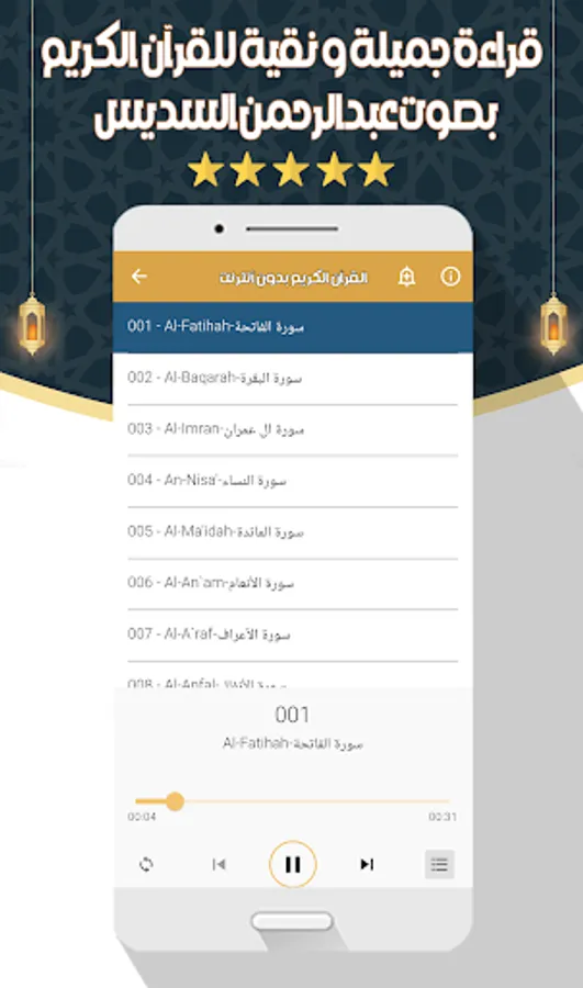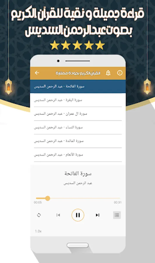 The application of the Noble Qur’an with the voice of Abd al-Rahman al-Sudais allows you to hear all the surahs of the Holy Qur’an through your mobile phone or tablet with ease and ease through one program that contains all the surahs of the Holy Qur’an. for Android phones. In order to enjoy reciting the Noble Qur’an with the voice of Sheikh Abdul Rahman Al-Sudais wherever you want.