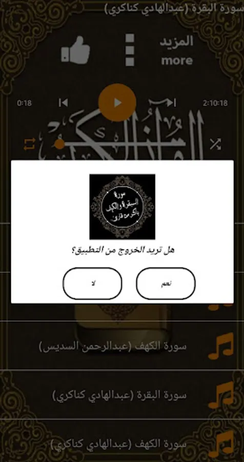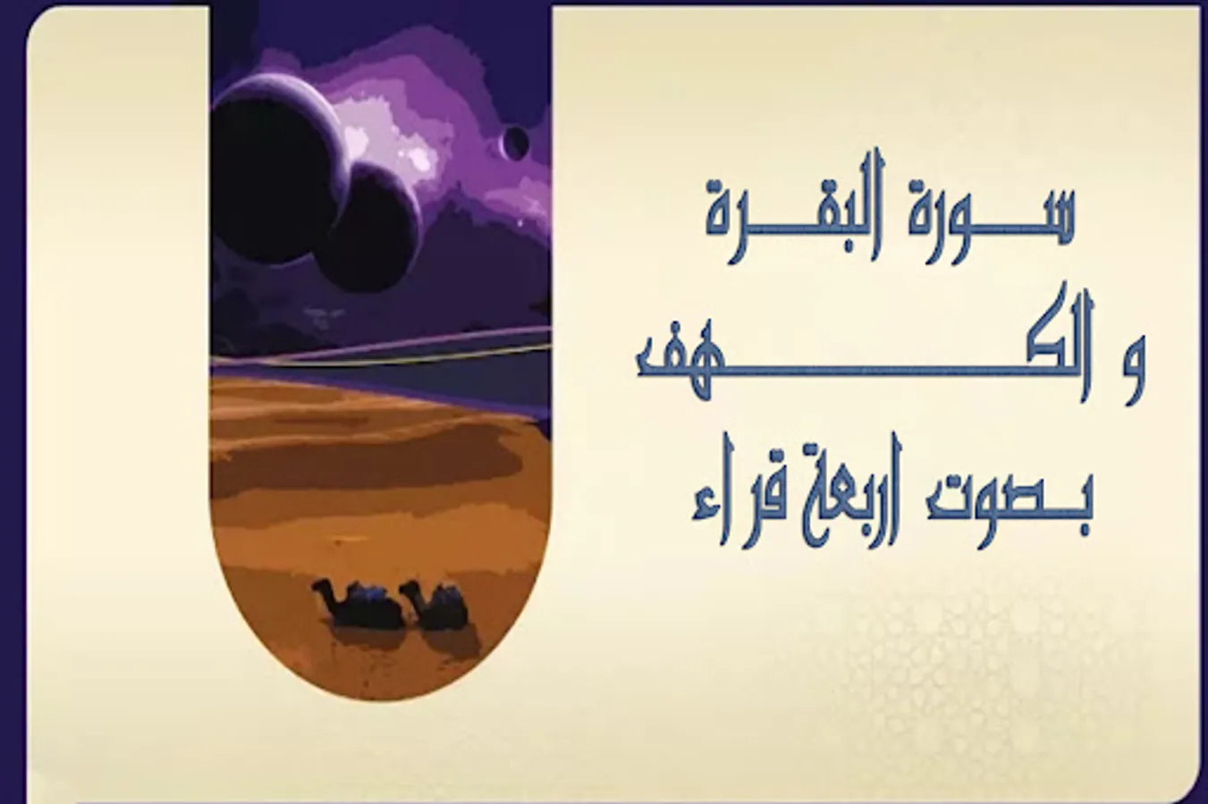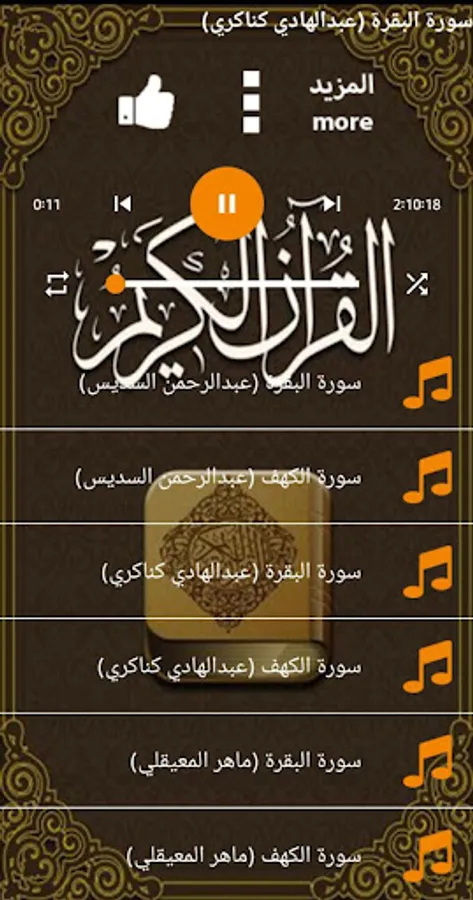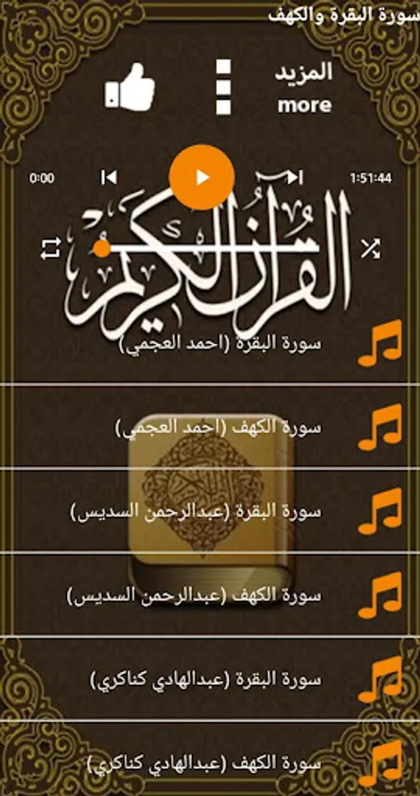Surat Al-Baqara and Al-Kahf with the voice of Sheikh Maher Al-Muaiqly, Sheikh Abdul Rahman Al-Sudais, Sheikh Abdul Hadi Al-Kanakry and Sheikh Ahmed Al-Ajmi, audible and buttons to turn the surahs and repeat without the Internet. Enjoy the application.