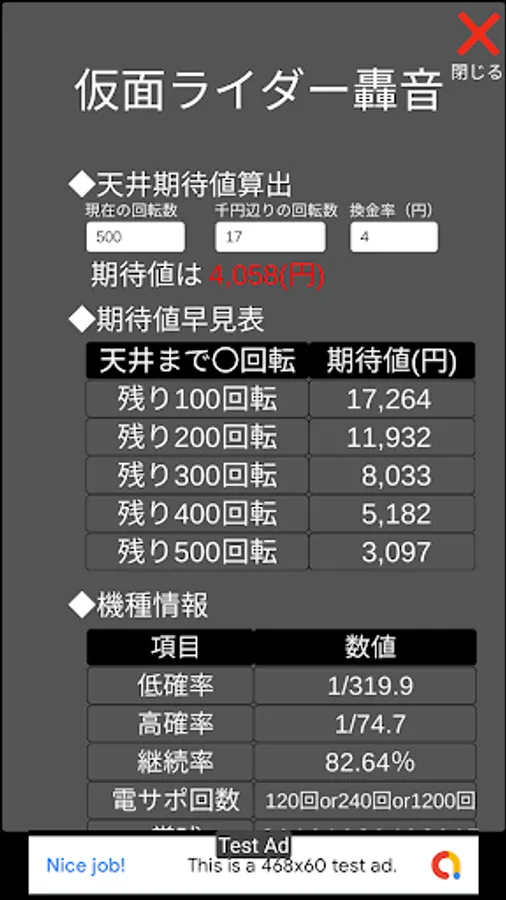 「パチンコ」の天井期待値を計算出来るアプリです。
