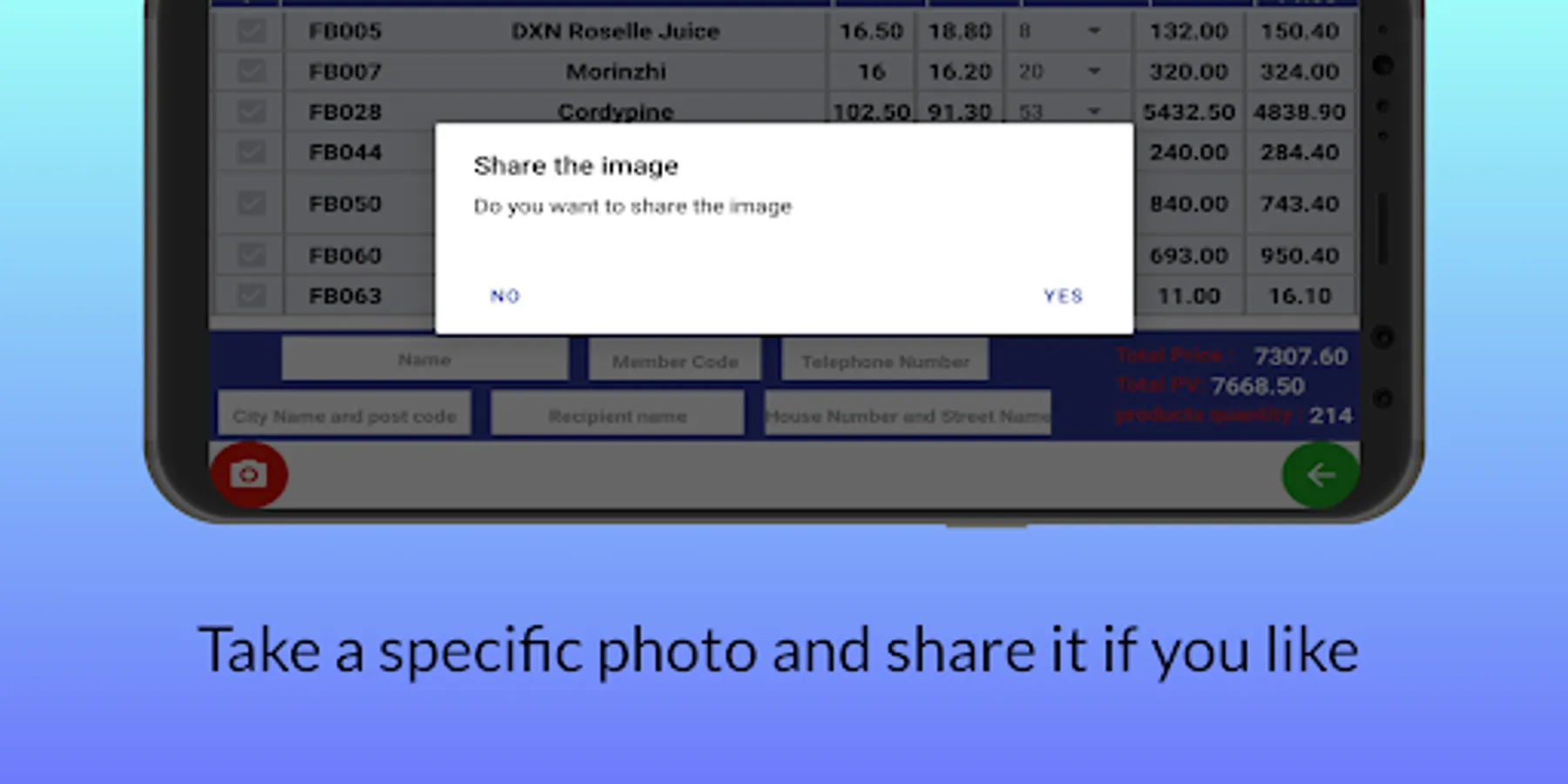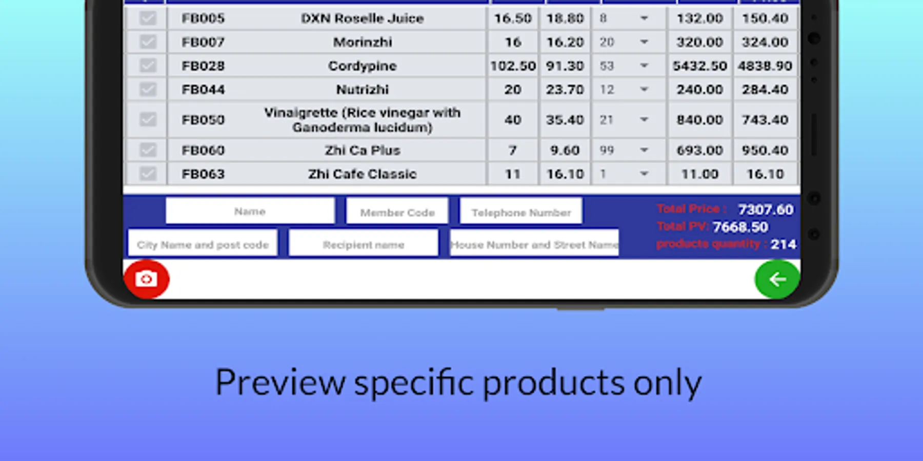 - Preview the selected products, add the member's name, membership number, address, received name and phone number, take a picture of it, save it automatically in files, and share it if you want