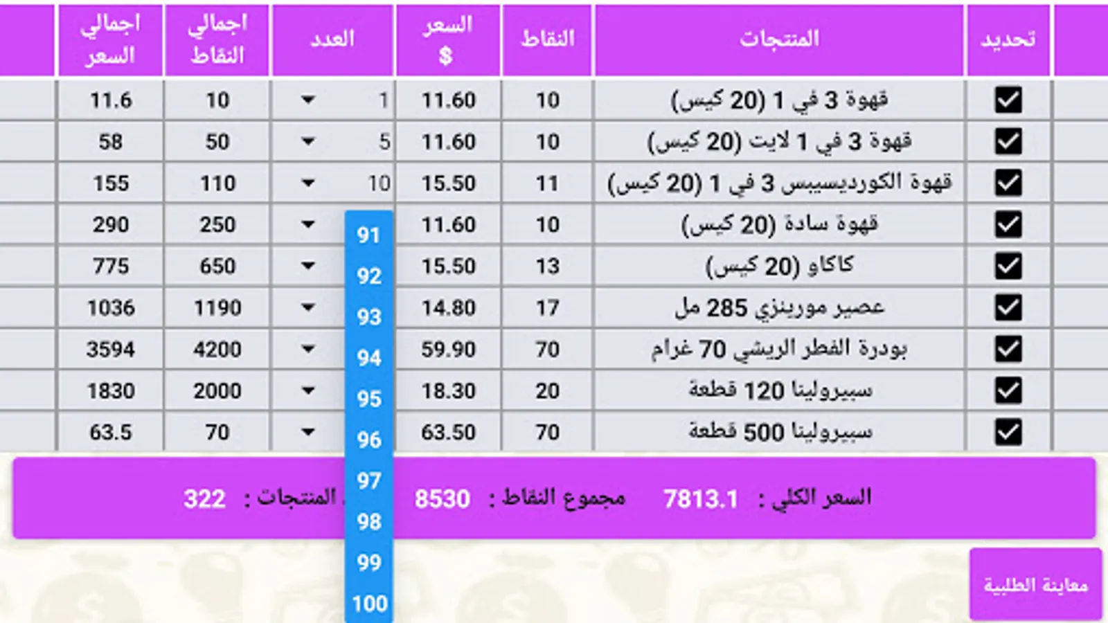 The ability to calculate prices and points from one product to one hundred products