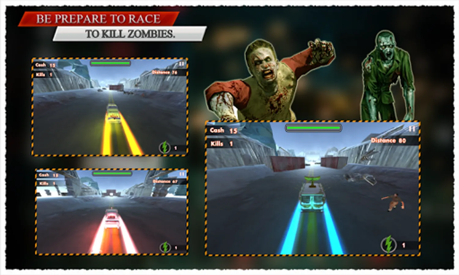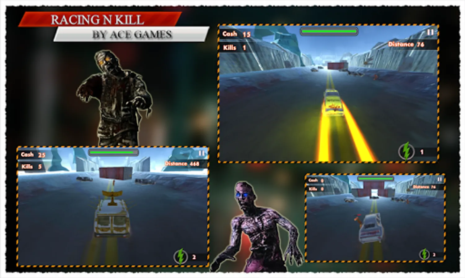Are you bored with doing something…? come and have some thing wow and woooh kind of smart ride with ‘Racing n Kill’. Ride on with your vehicle to chase an endless destination. Kill the irritating zombies with your armed vehicle... Race and Kill with creepy zombies which attacks you and stops you from reaching your destination. Drive your way through a zombie apocalypse. Avoid hitting the obstacles to maintain the speed...‘aah nooo…. a war chariot is the correct word to describe your vehicle’ to protect yourselves in the way to chase endless from zombie and slide your smart piece to escape from the hurdles..