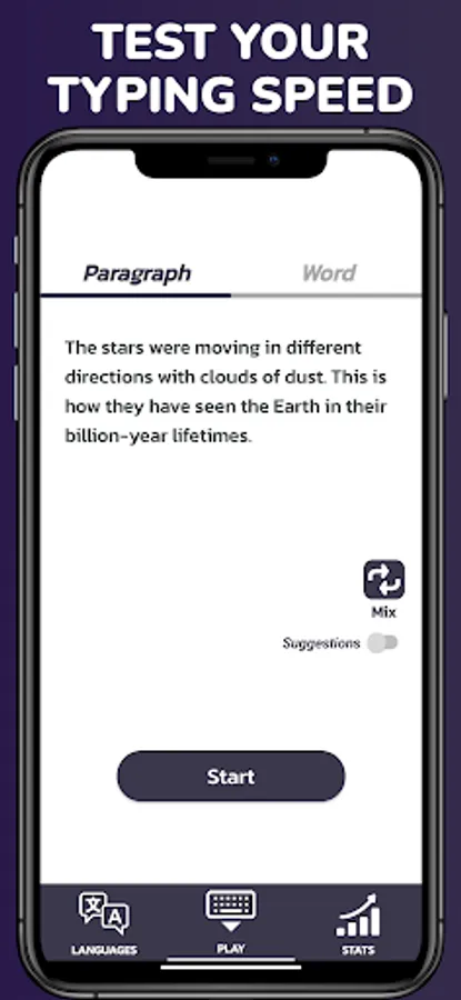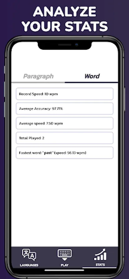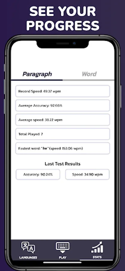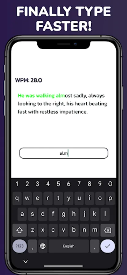 ● Instantly view your WPM (Words Per Minute) score and other stats