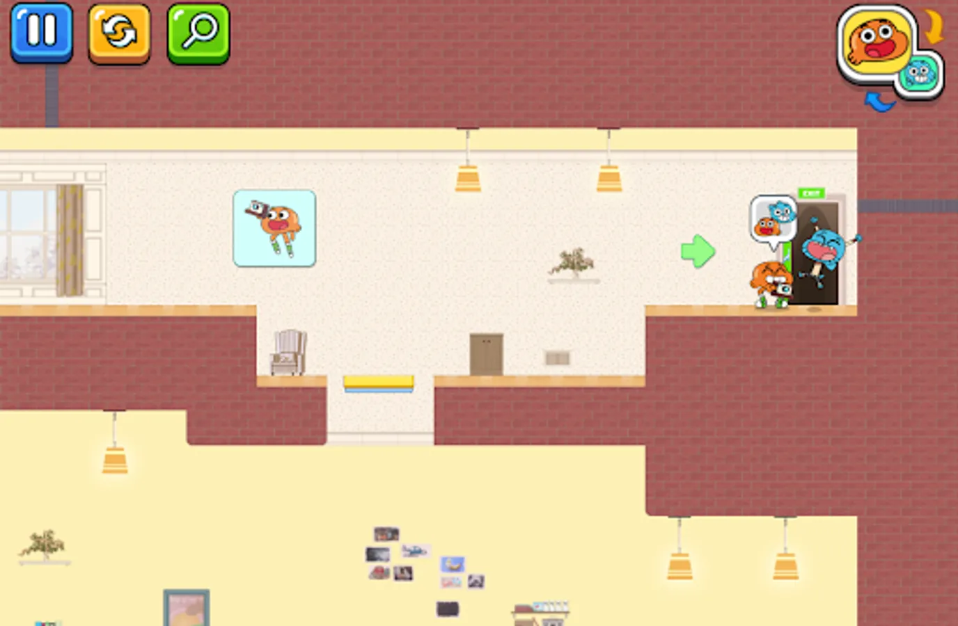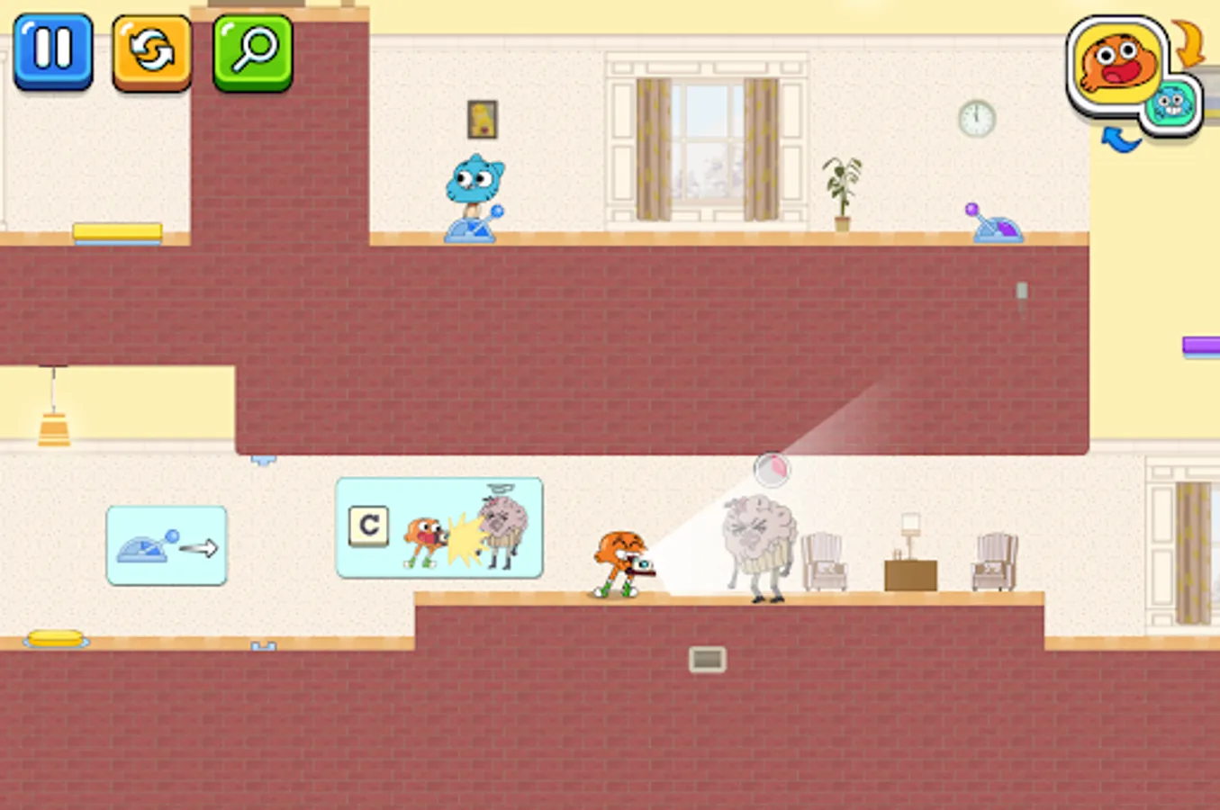 The arrow keys on your screen will make a character move. The tricky part is that you cannot move both of them at the same time. You have to switch control between Gumball and Darwin, according to the surroundings. To do that, you can press the switch icon .