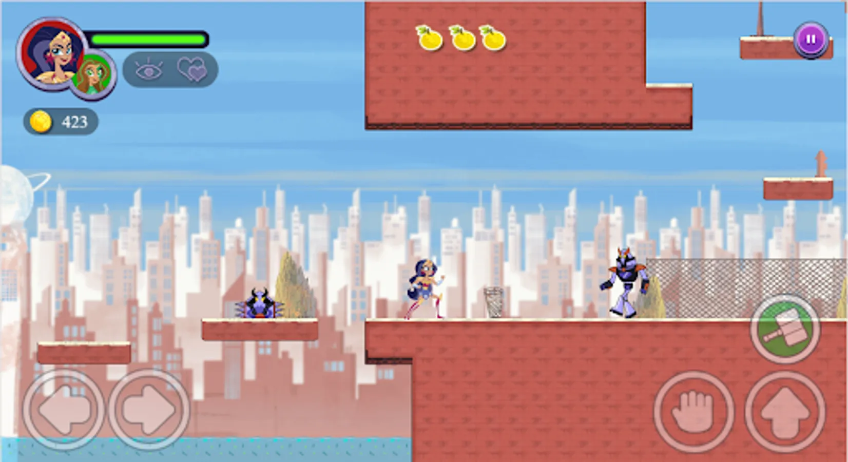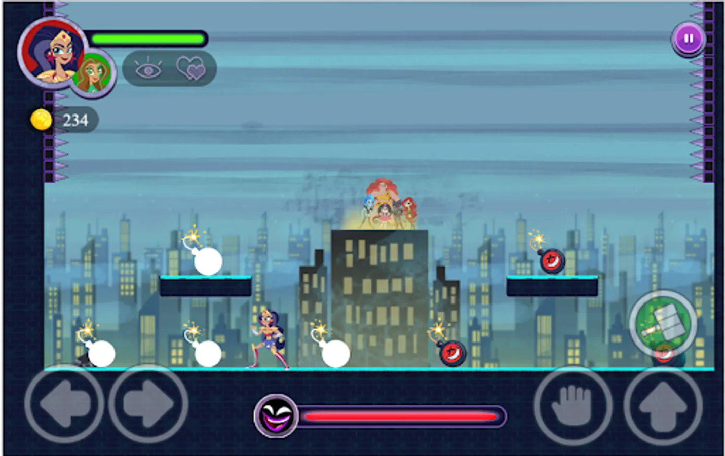 You will be able to unlock ten adventure levels in which the Superhero Girls are going to need your help to defeat their enemies and villains! To finish the adventure, you can see that you will have to use the ARROW keys on the screen ! they are used to move on the map with the Superhero Girls and the hand button is used to make your hero avatar to jump.