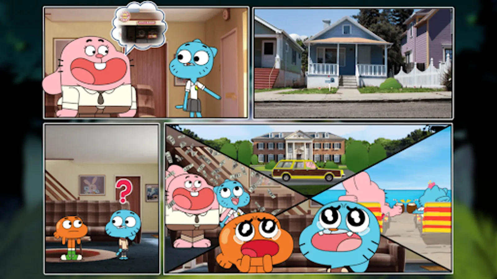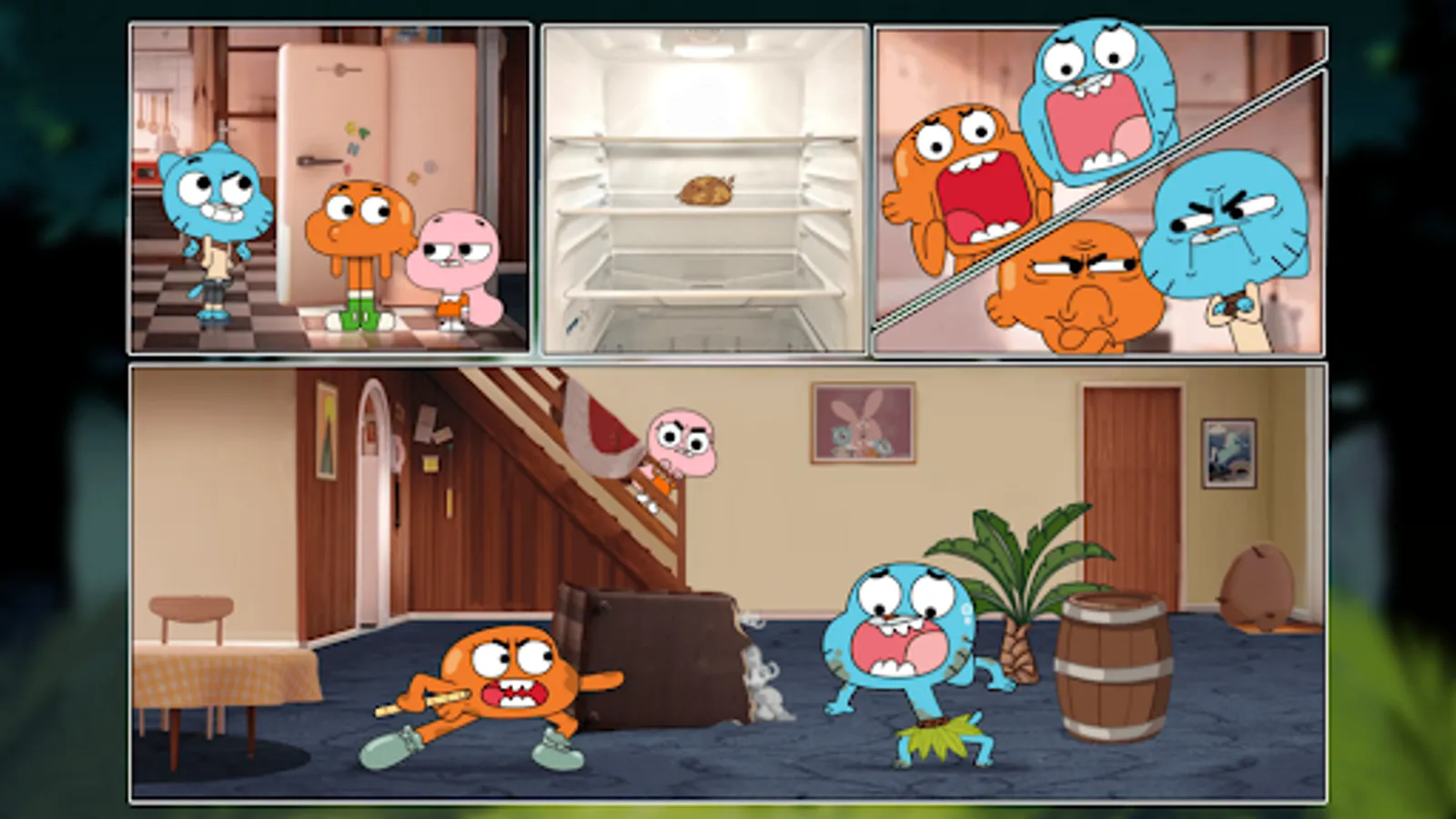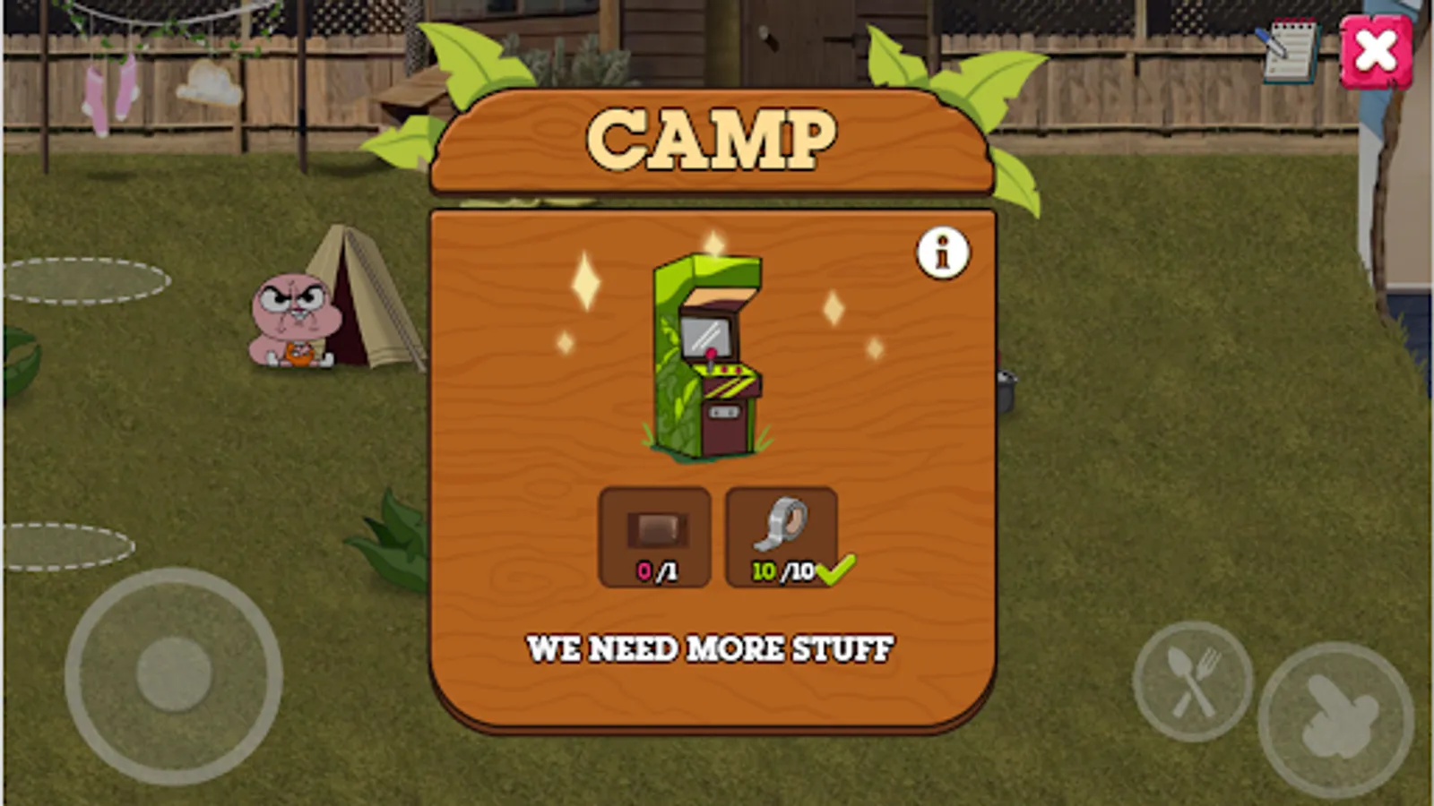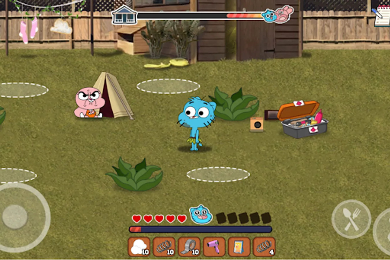 Gumball starts outside where he must build a camp to survive. Gumball gathers materials from inside and outside the house. Anais will also give Gumball materials, but provoking her will make her attack Gumball. Darwin is also a major hazard. Darwin will appear in random rooms and attempt to shoot Gumball with darts. If Gumball is hit, everything will go dark. Once Gumball wakes up, he finds most of supplies are gone and he has taken damage. The only way to avoid Darwin is to run away to another room.