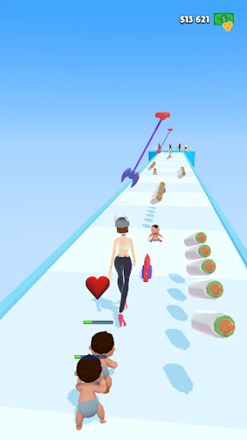 Run along the road, collect children's food to feed the children. With each bottle collected, the kids get bigger and bigger. At the finish line, a support group is waiting for you - parents who left their children under supervision.