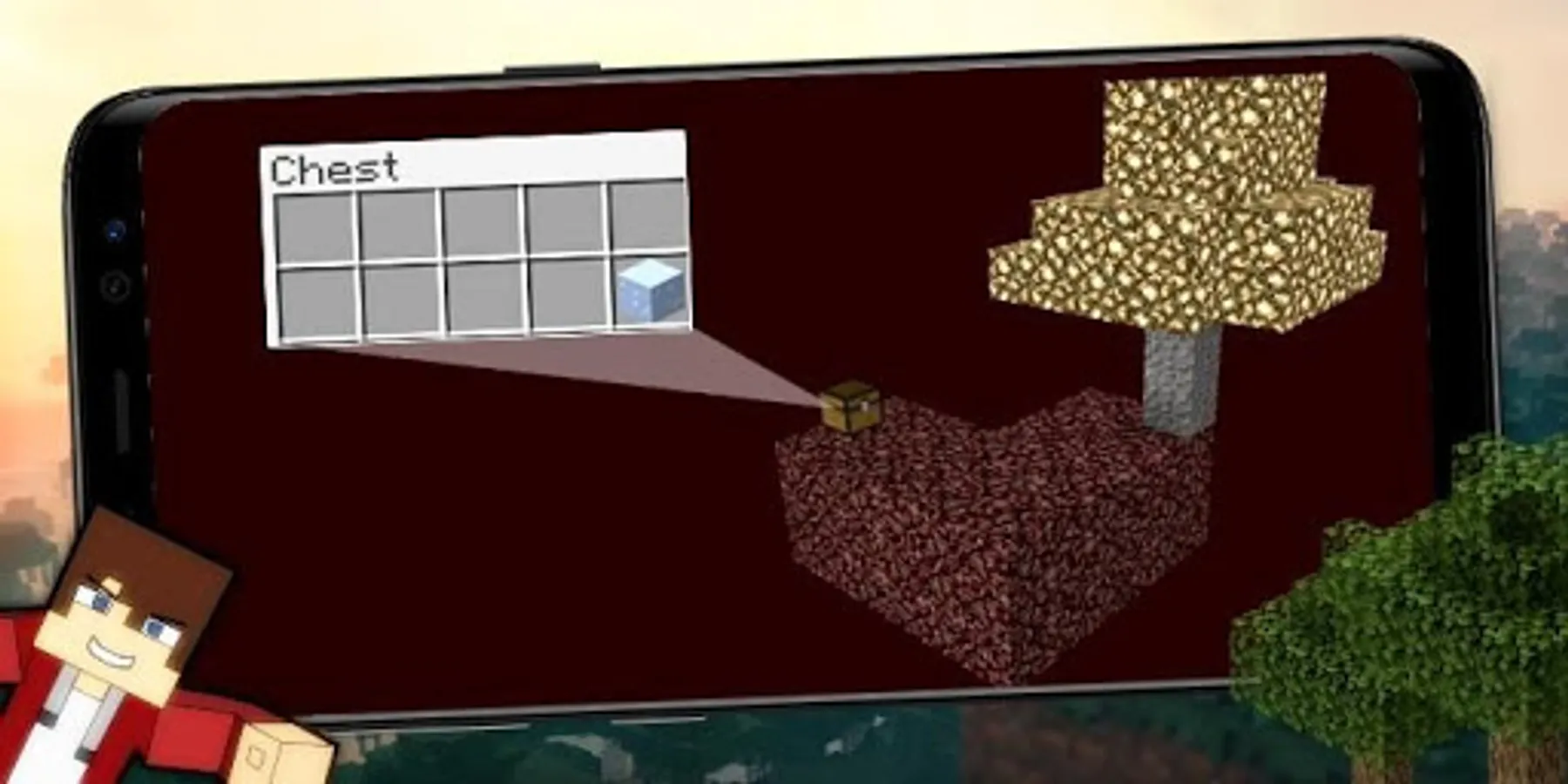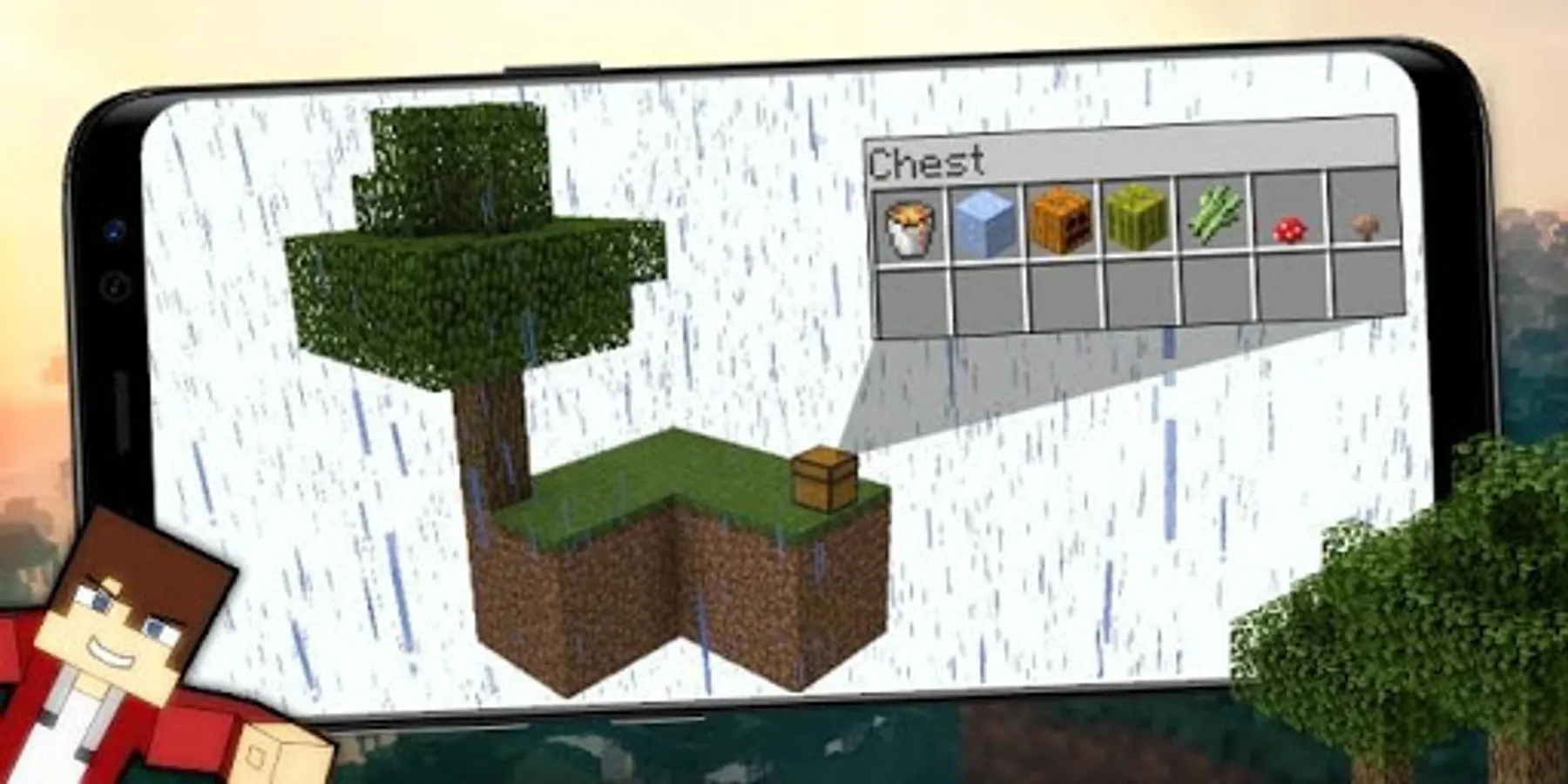 Start off in the overworld on an island in the sky. The only things you will have are the items found in the chest and whatever blocks you can find on the island (and surrounding terrain).
