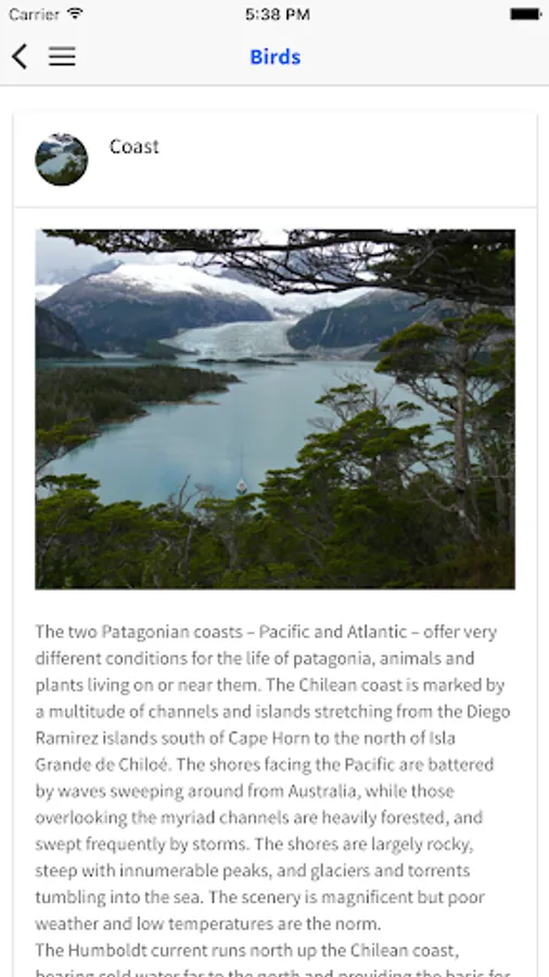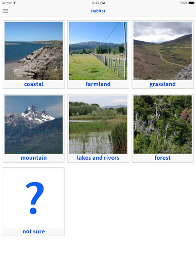 Tapping on the habitat button on the top-level menu provides a description of the main habitats of Patagonia, together with photographs.