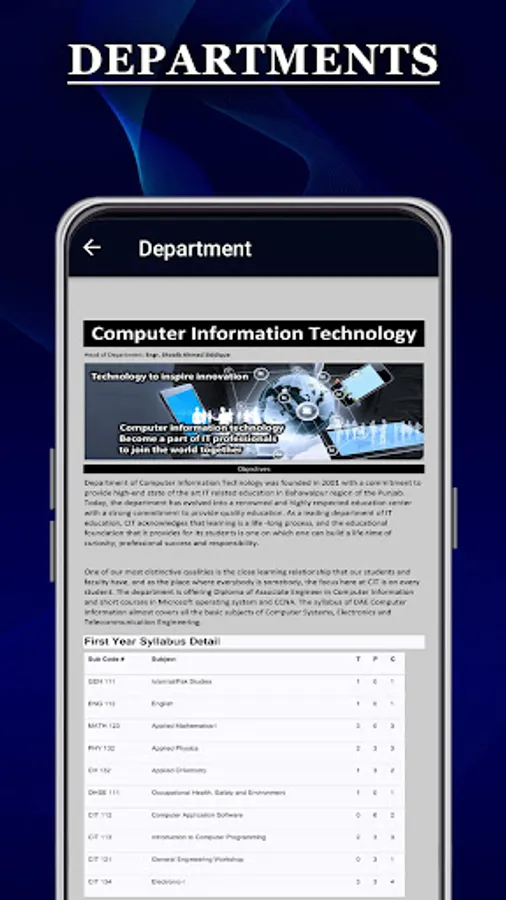 If Anyone wants to get information about departments such as morning classes, evening classes, fees,s or complete syllabus you can get all this information from this app.