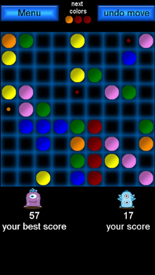 If the player has formed a series of at least five dentical colored balls, they disappear and the player receives points for it. A row of five balls scores 5 points, six balls 12, seven 21, eight 32 and nine balls 45 points. He can also move another ball without having to deal three new balls in the field. The game ends when all squares are filled with balls.