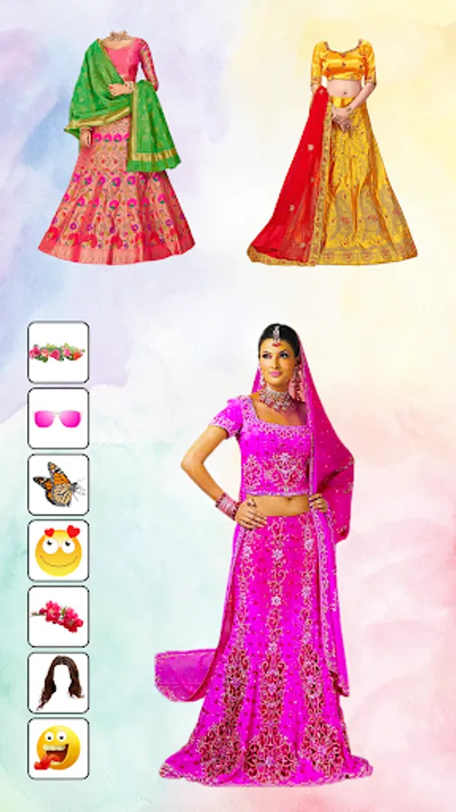 Chaniya Choli Photo Suit Editor has Chaniya choli, Goggles, Flower crown stickers, butterfly, flowers and smiley stickers.
