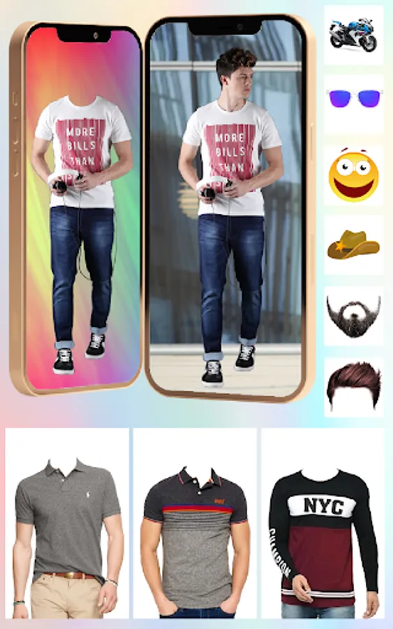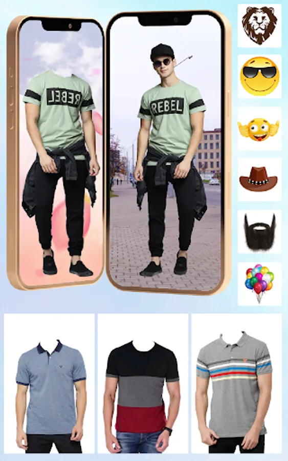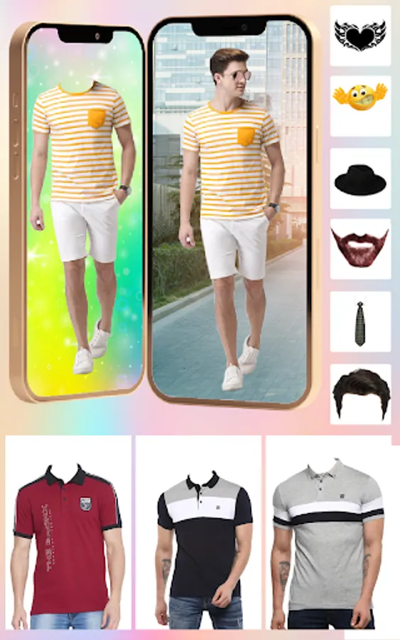 Men T Shirt Photo Suit Editor - Design T Shirts has Men design t shirts, Beard, Man hairstyle stickers, Mustache and beard, men Sunglass, Tattoo stickers, emoji and smiley stickers.