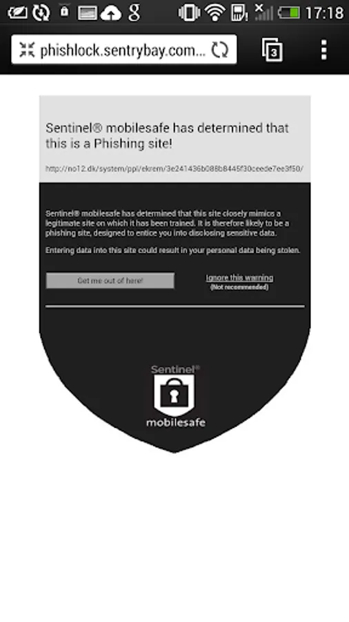 Once Sentinel® mobilesafe software is installed on your smartphone, it will also provide you with protection whilst browsing the internet against the phishing sites. If you try to navigate to a phishing page, a warning will appear, allowing you to steer away and safeguard you from entering personal or financial data.