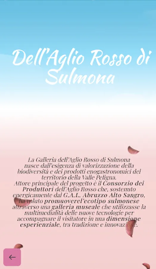 The Gallery of the Red Garlic of Sulmona is a multimedia gallery that aims to accompany the visitor in an immersive cognitive experience, through the reconstruction of events, images, sounds and testimonies of what can be considered, besides that a prized native species, an important factor for the construction of local identity. Multimedia and the experiential dimension aim at a completely new use of the museum object and at an involvement of the visitor that is as active as possible.