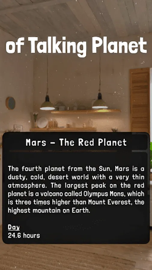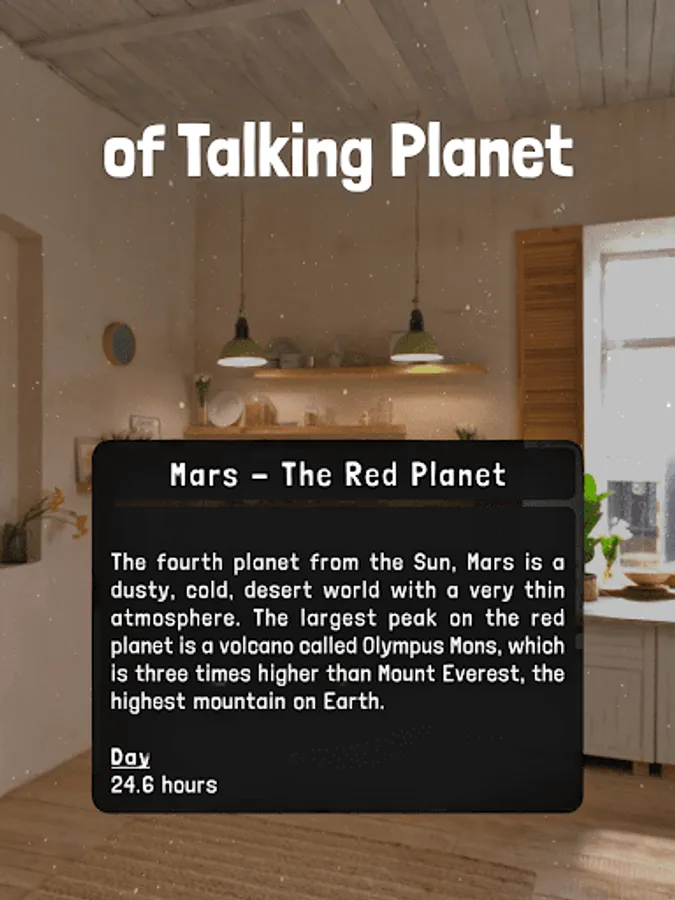 📚 But that's not all, our app is more than that - it's also a teacher! Each planet speaks its name and tells you about itself, so you can learn amazing facts and see detailed information about each planet, dwarf planet, and moon. And don't worry, you won't be alone on this journey - our Talking Planets will guide you every step of the way!