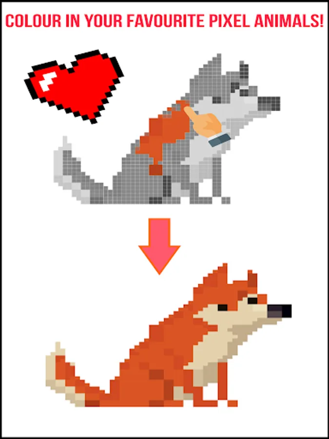 Use your fingers to draw/color hundreds of pixel pictures in this relaxing, stress-free game. Unwind, relax and discover a new world full of fun images to color. Use a big palette of vibrant colors to create a beautiful picture using just your fingers. Draw/color it in 1 stroke of your finger and the possibilities are endless.