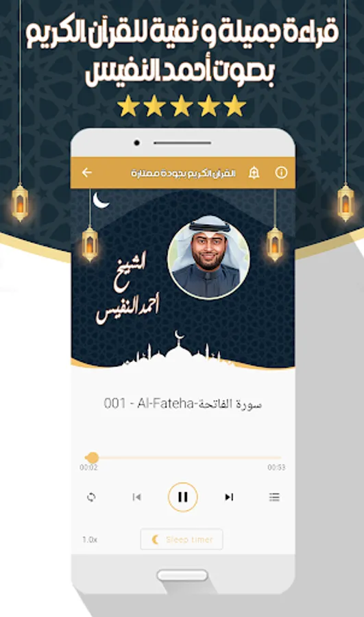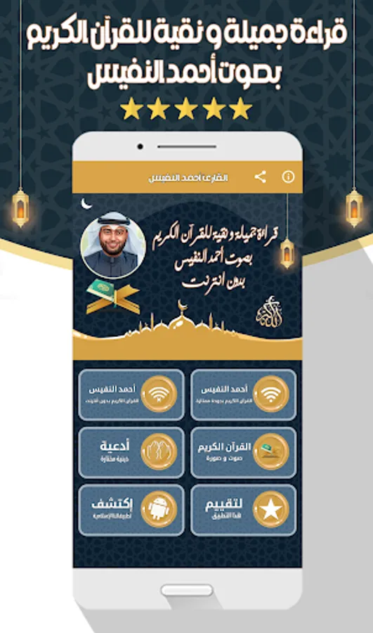The tablet is easy and convenient through one program that contains all the surahs of the Noble Qur’an, and the Qur’an recitation application is characterized by the voice of Ahmed Al-Nafees by being free and available on the store for Android phones. In order to enjoy the recitation of the Noble Qur’an and live a wonderful state of faith in which you delve deeper into the meanings of the Noble Qur’an, enjoying the voice of Sheikh Ahmed Al-Nafis, who transports you to another world with his distinctive voice.