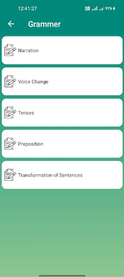 Grammar : 1. Narration, 2. Voice, 3. Tenses, 4. Preposition, 5. Transformation of Sentences