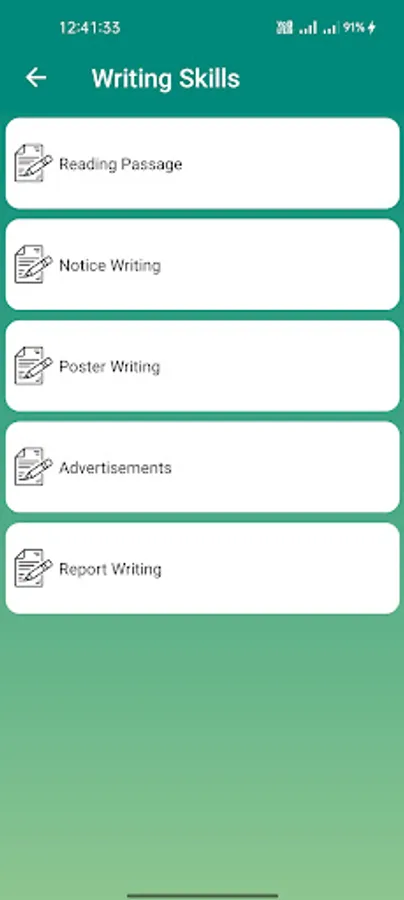 Writing Skills: 1. Reading Passage, 2. Notice Writing, 3. Poster Writing, 4. Advertisements, 5. Report Writing