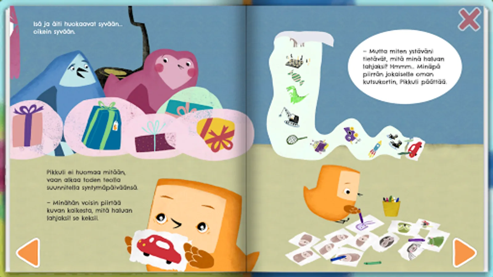 The application is adapted from the book Pikkul's Birthday (2017) published by Kustannus-Mäkelä Oy.