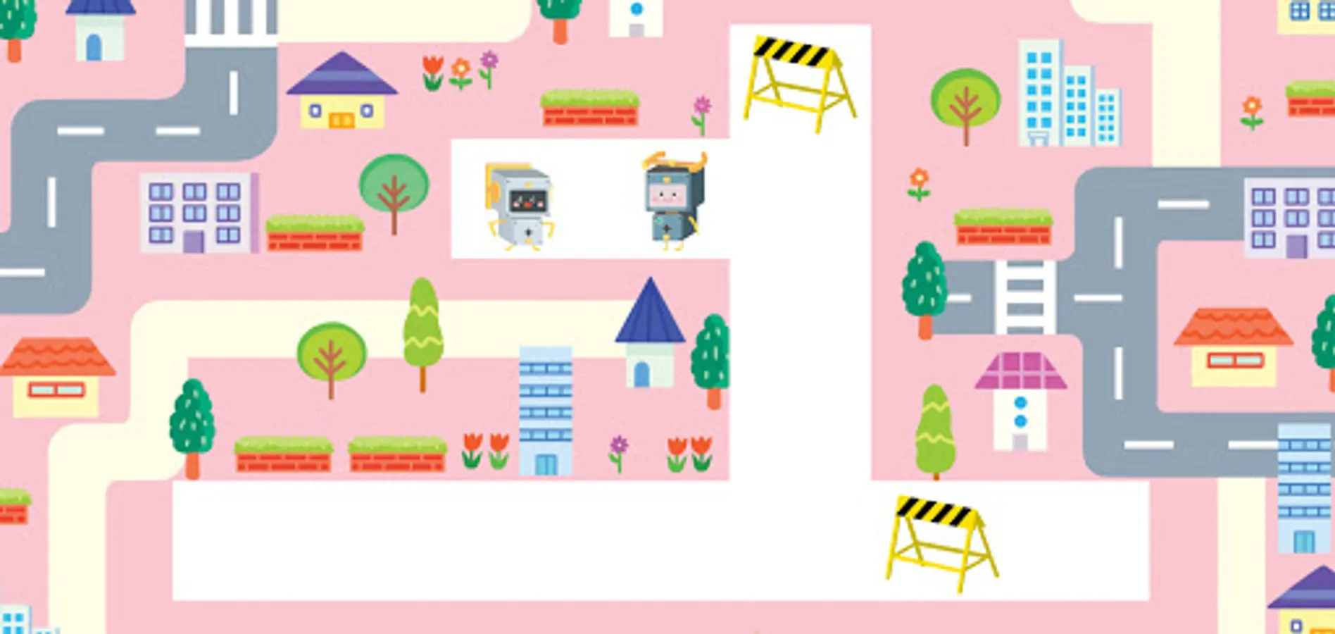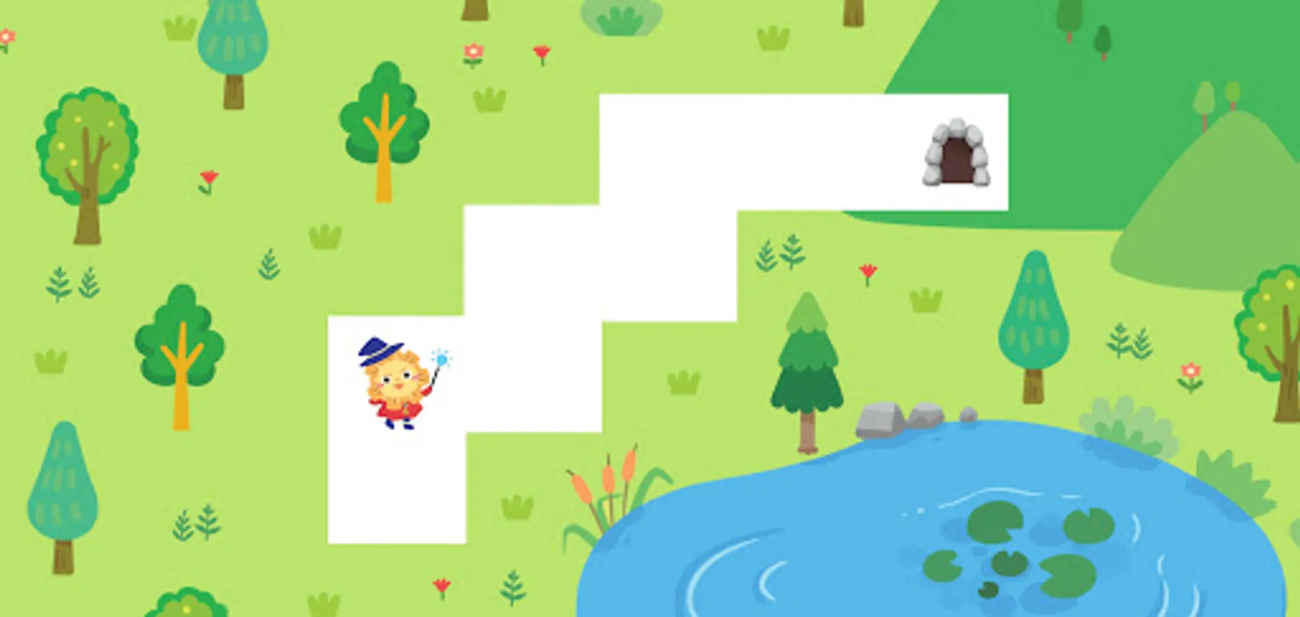 In each stage of the Math Coding Plus app, you need to place command blocks and recognize and execute the code for mission success. As you progress through the game, you will learn sequential, repetitive, function, conditional, move, and other programming terms.
