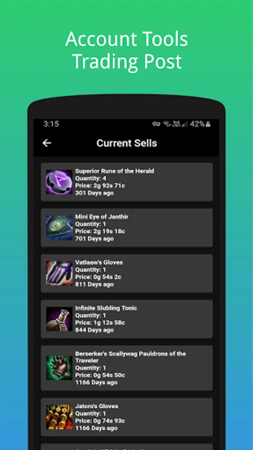 • Trading Post (Current Buy and Sell, Past Buy and Sell, and Item Delivery)