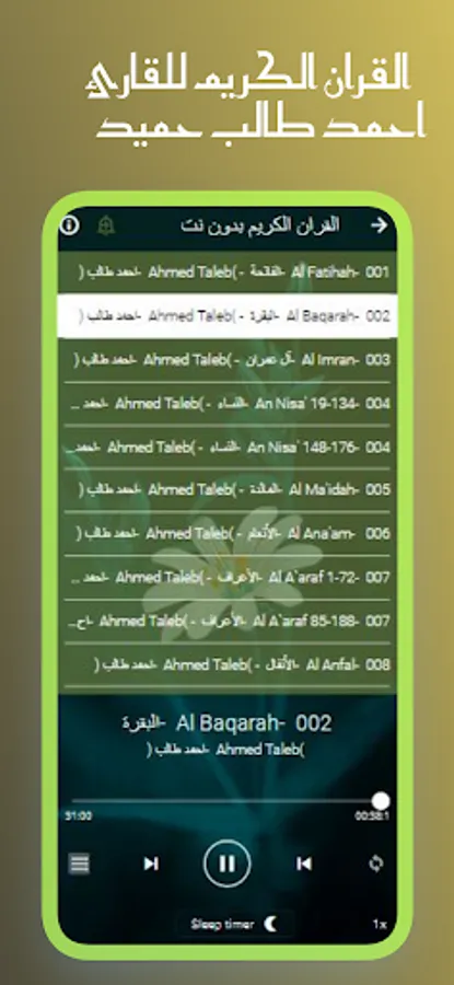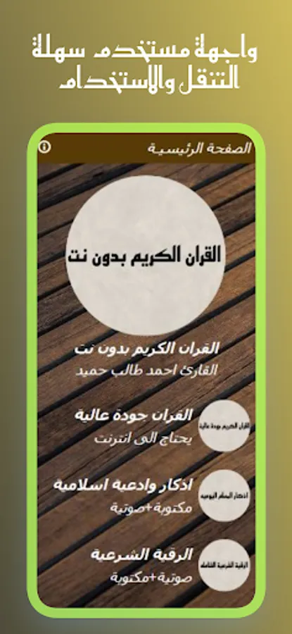 We offer you an application that is one of the most powerful Islamic audio applications, an application that is characterized by smoothness and ease of use, with consistency and mixing between the application files while navigating within the application of the Qur’an with the voice of Sheikh Ahmed bin Talib Hamid