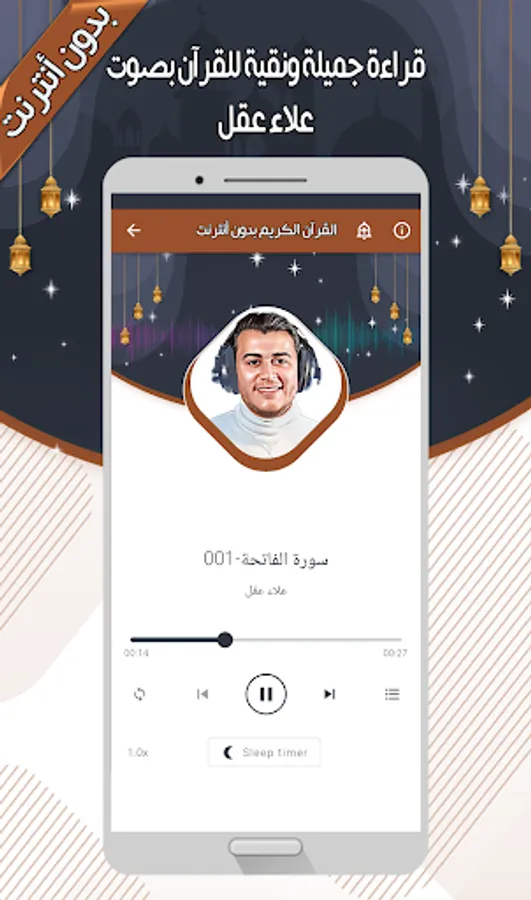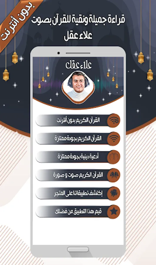 The Alaa Aqel - Quran without Internet application is also distinguished by being free and available on the store for Android phones, so that you can enjoy reciting the Noble Qur’an with the voice of Sheikh Alaa Aqel wherever you want.
