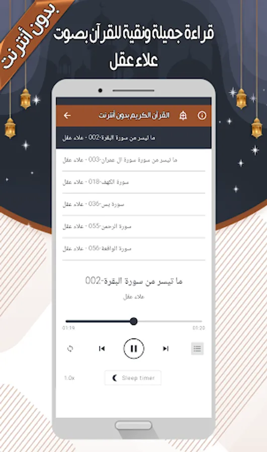 The Alaa Aql - Quran without Internet application allows you to hear all the surahs of the Holy Qur’an through your mobile phone or tablet with ease and ease through one program that contains all the surahs of the Holy Qur’an,