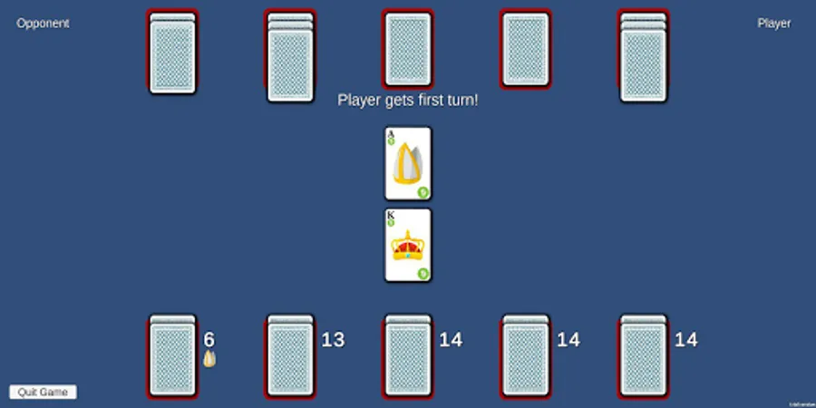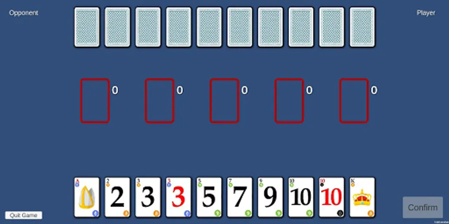 Both players get dealt ten cards and must arrange them into five units. There is no maximum size to a unit, however each unit must have at least one card. Once all units are formed, both players draw a card to see who goes first. The player with the highest value card will start by choosing one of their own units and one of their opponent's units. The two chosen units will fight and the unit with the highest total value will win the round. To win the game, you must win three rounds.