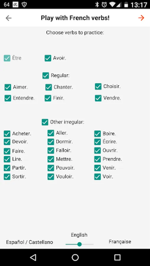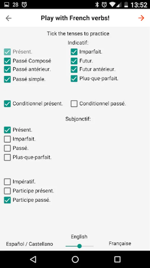 • French regular and irregular verbs and tenses to practice, conjugate and learn can be selected / unselected from the list.