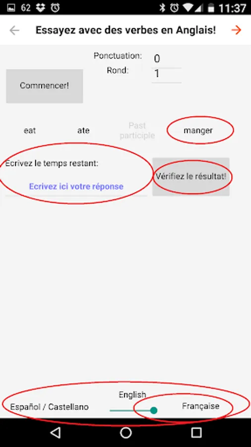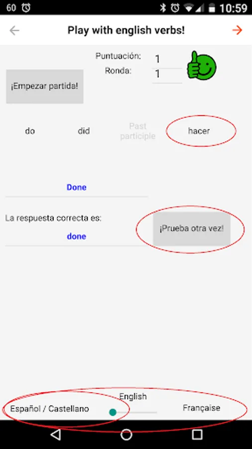 • Beware of the accents when used in Spanish or French!!!: Remember that in school / college (in primary and in secondary), if you do not write the accents, the answer can be set as "bad": This app is not only useful to learn the irregular English verbs and their meaning in Spanish and French, but it's also useful to learn to write with accents (you get used to it very quickly, because if you do not put the accent, the app will not give you the answer as valid!).